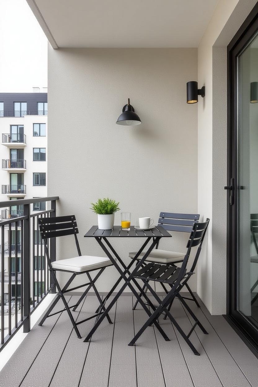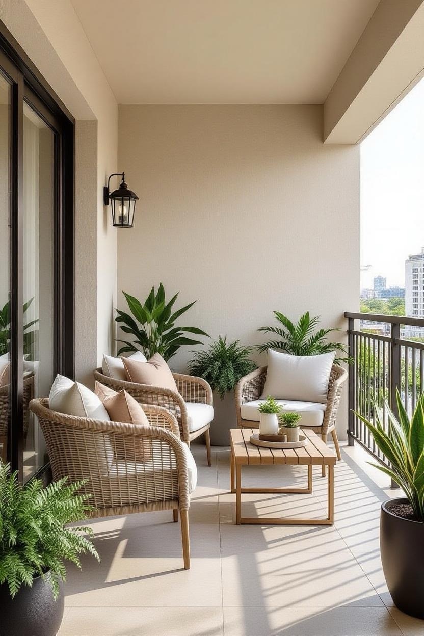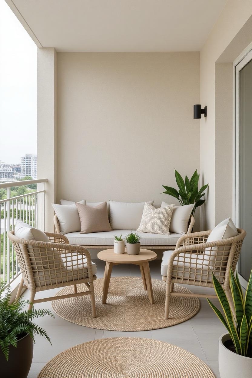 Opt for beige, cream, or taupe tones with sleek furniture for a sophisticated small balcony look.