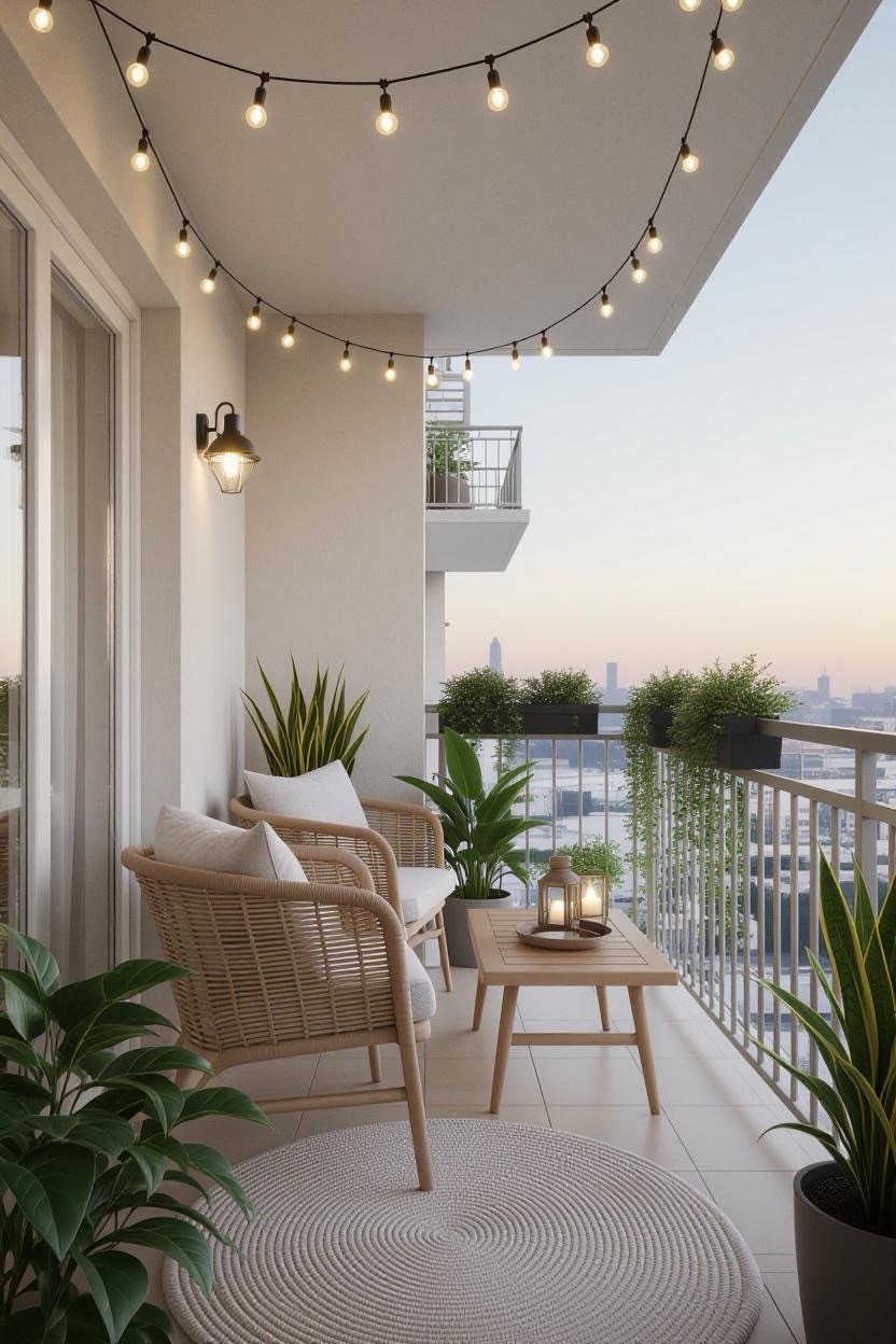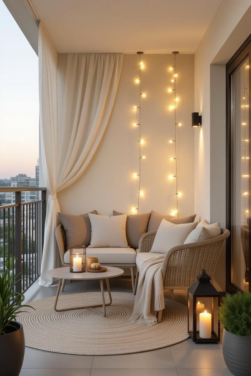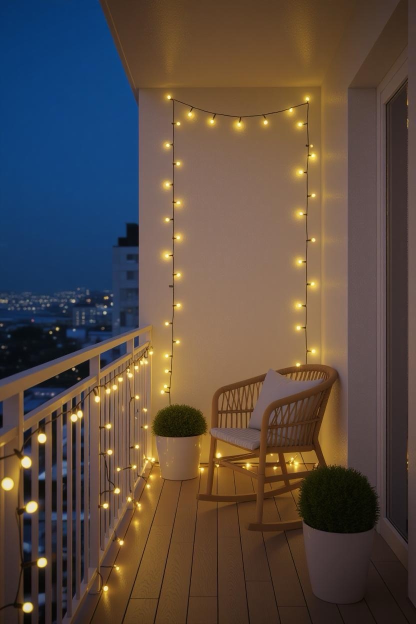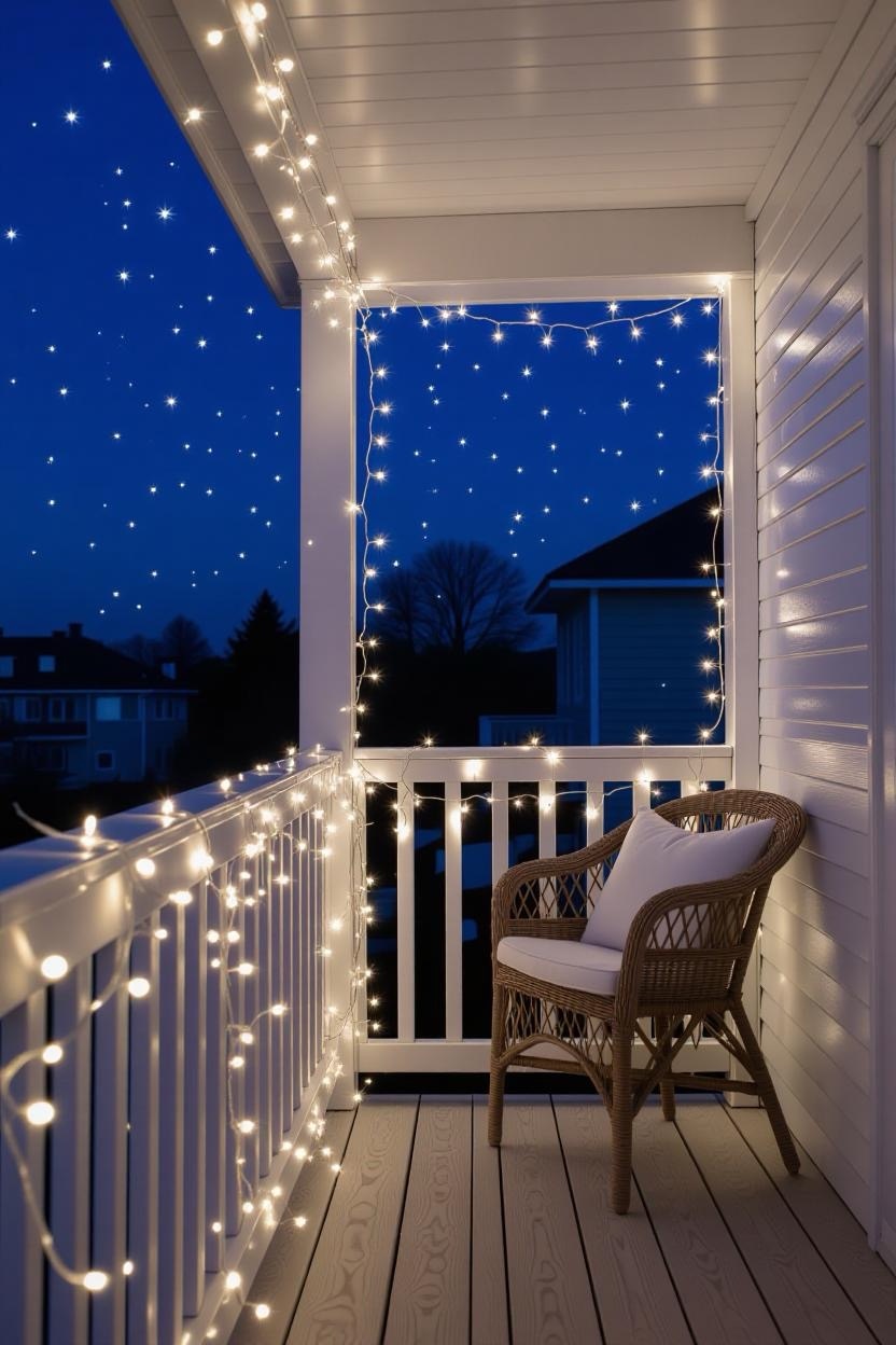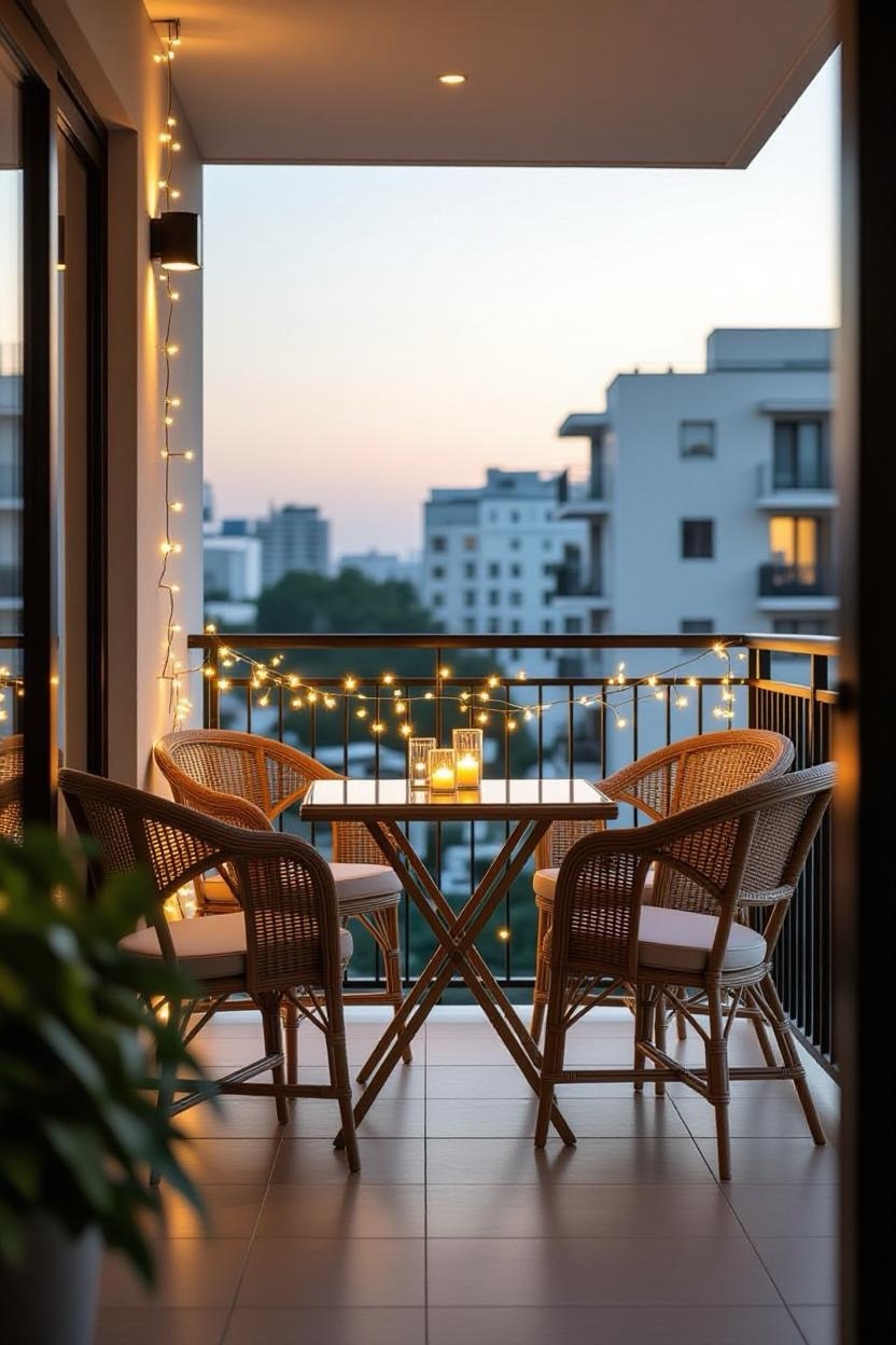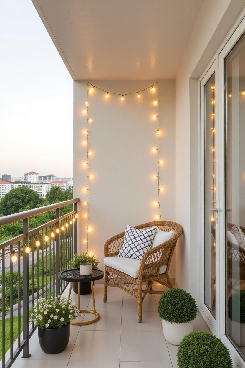 Drape string lights or fairy lights across your railing or overhead to instantly transform your balcony into a dreamy evening hangout.