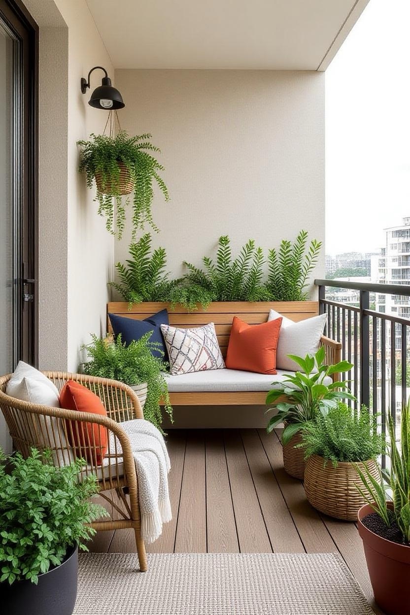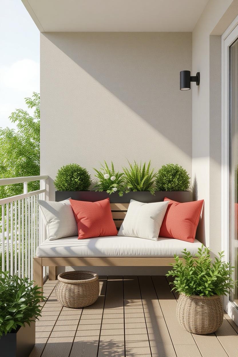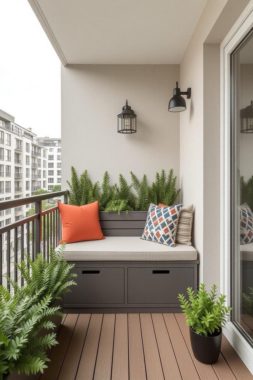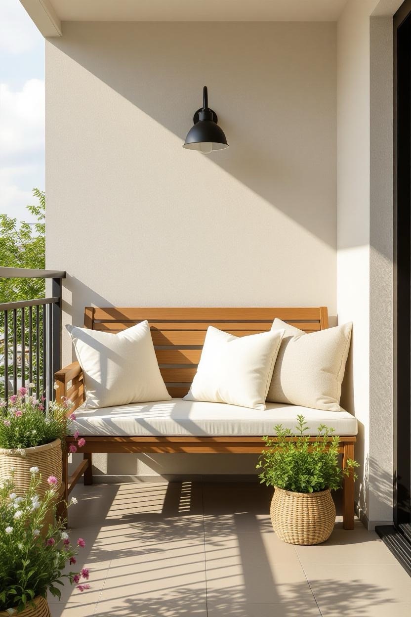 A slim bench with layered cushions and pillows can double as seating and storage. It’s perfect for maximizing a small balcony’s layout.