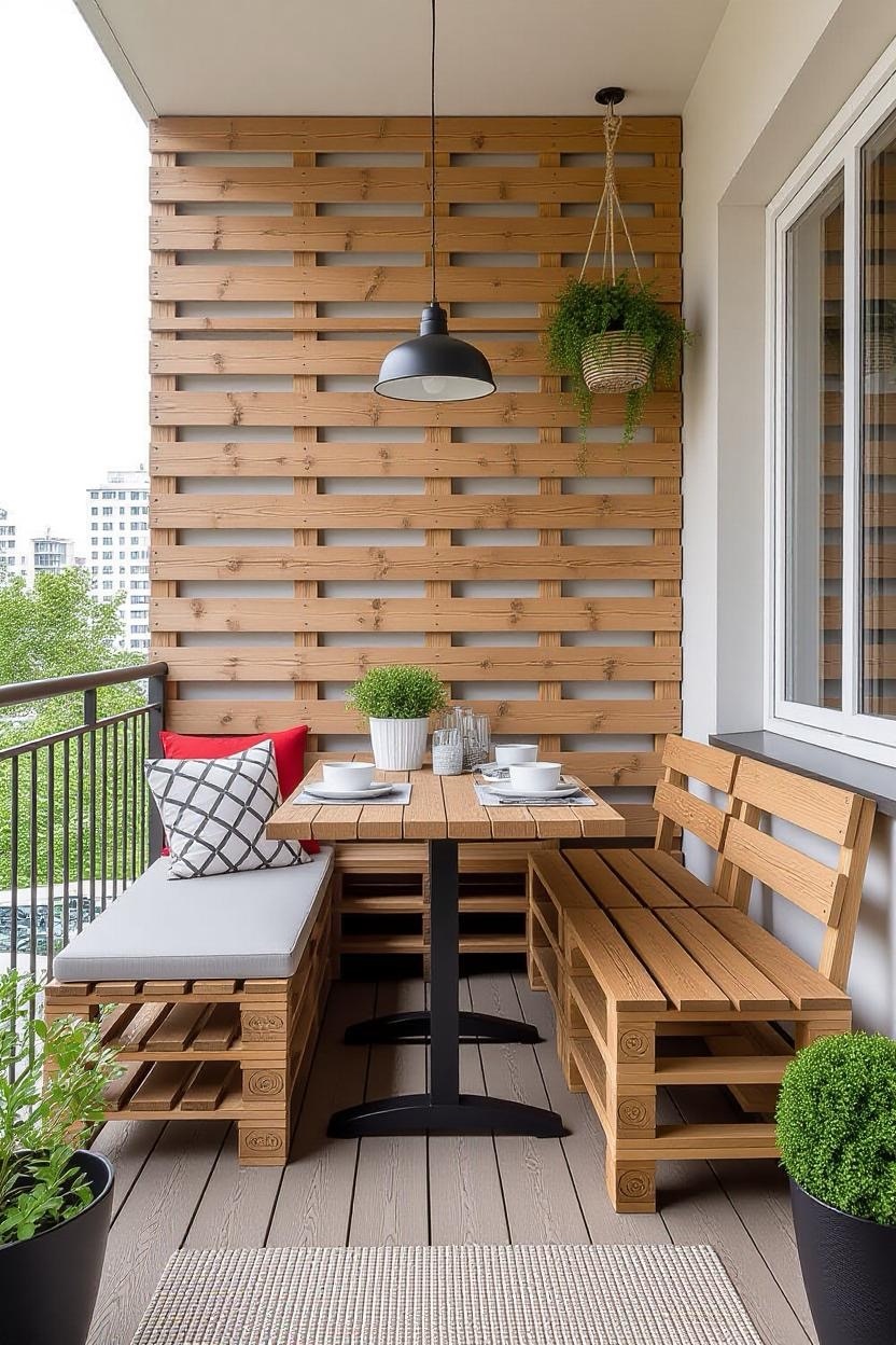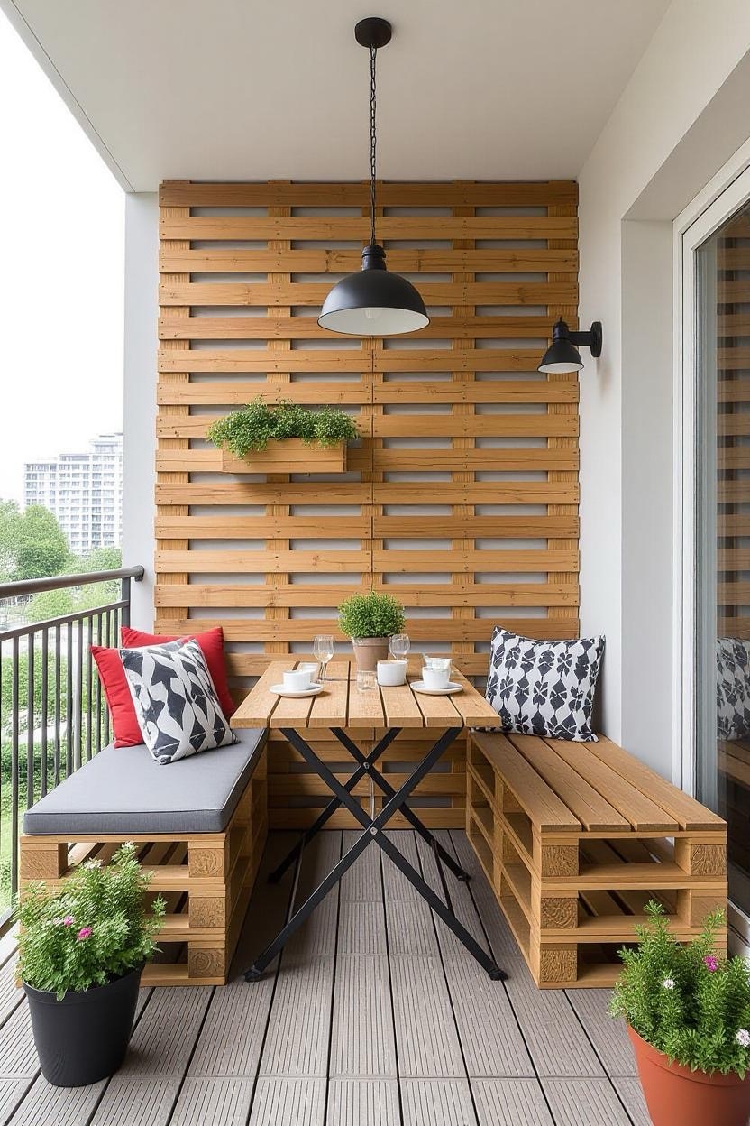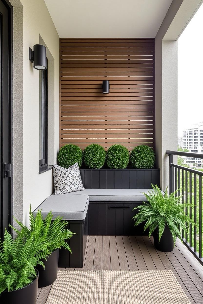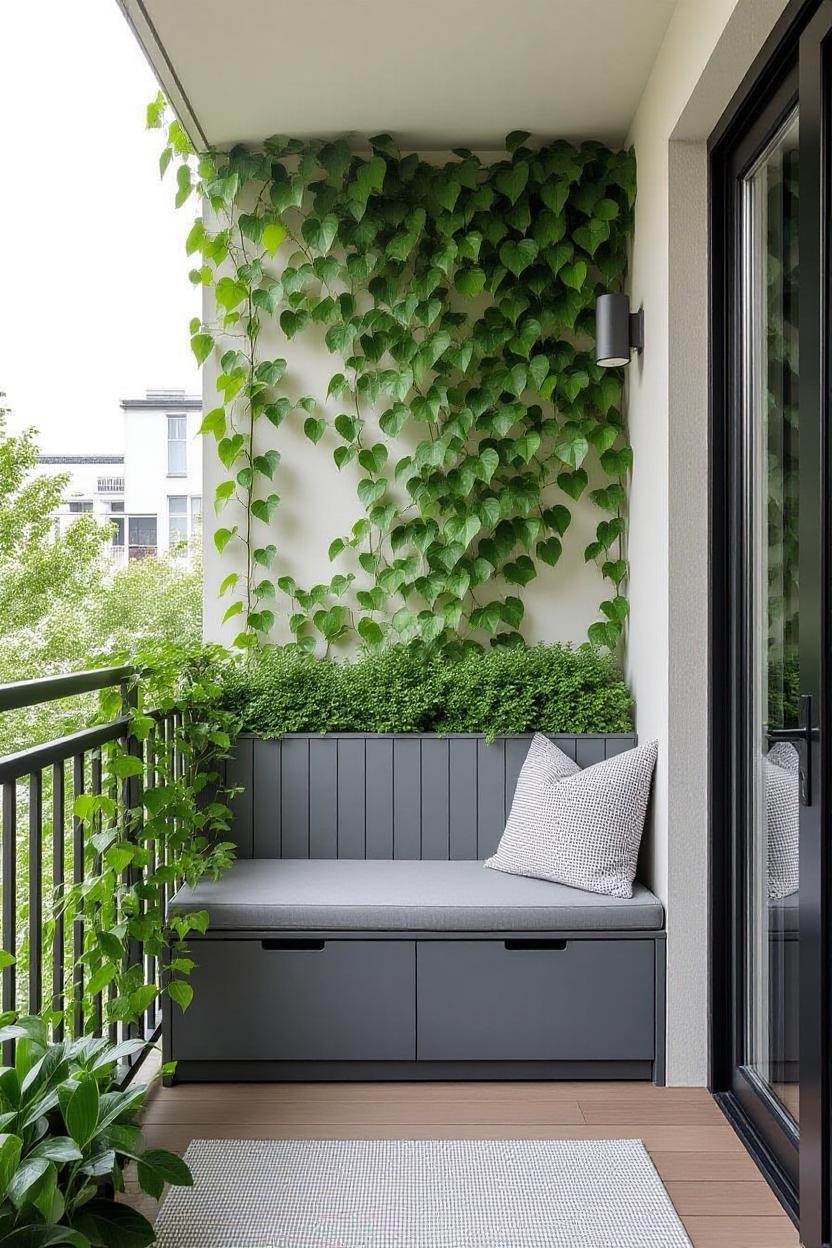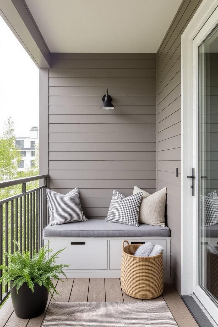A slim bench with layered cushions and pillows can double as seating and storage. It’s perfect for maximizing a small balcony’s layout.