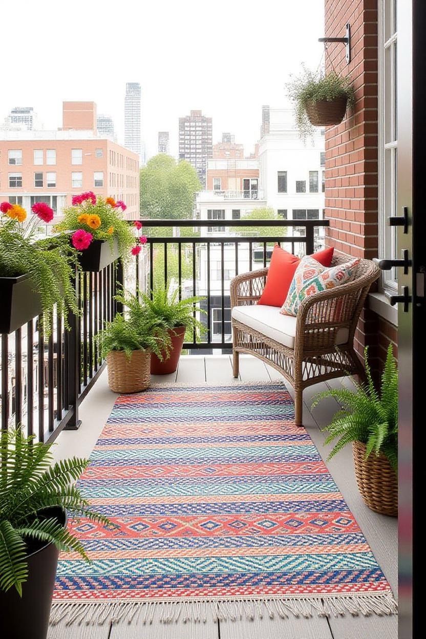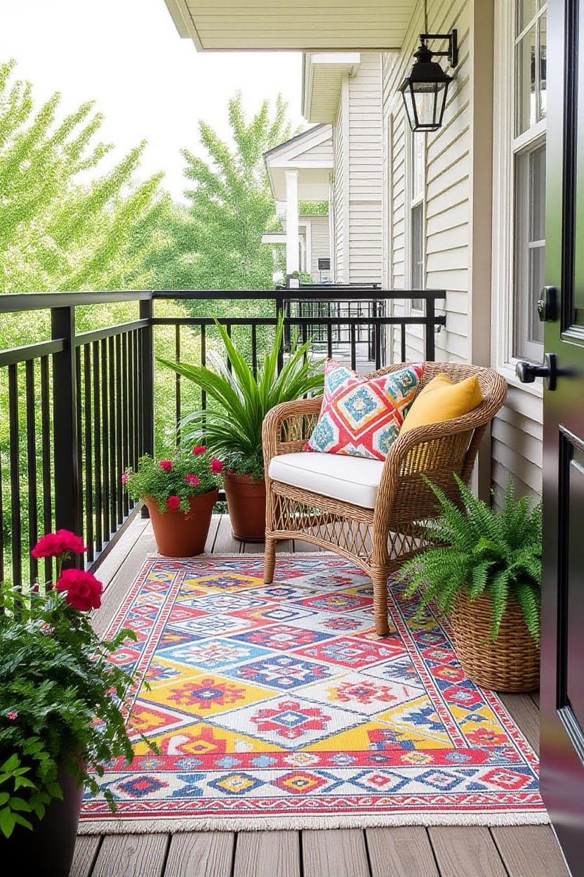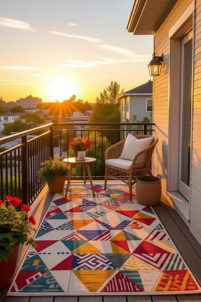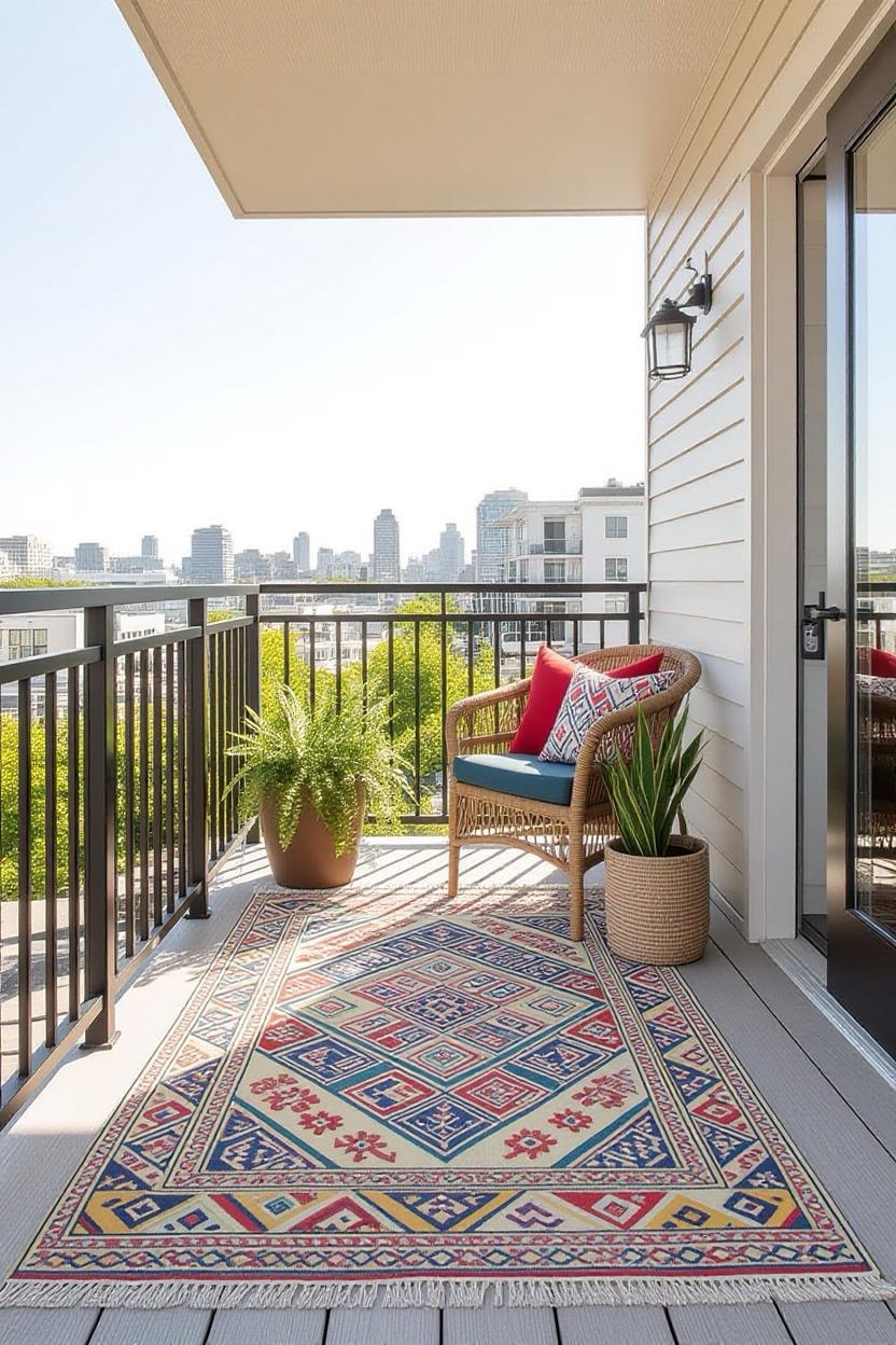 Place a colorful or patterned outdoor rug to define the area and make your balcony feel more like an extension of your indoor living room.