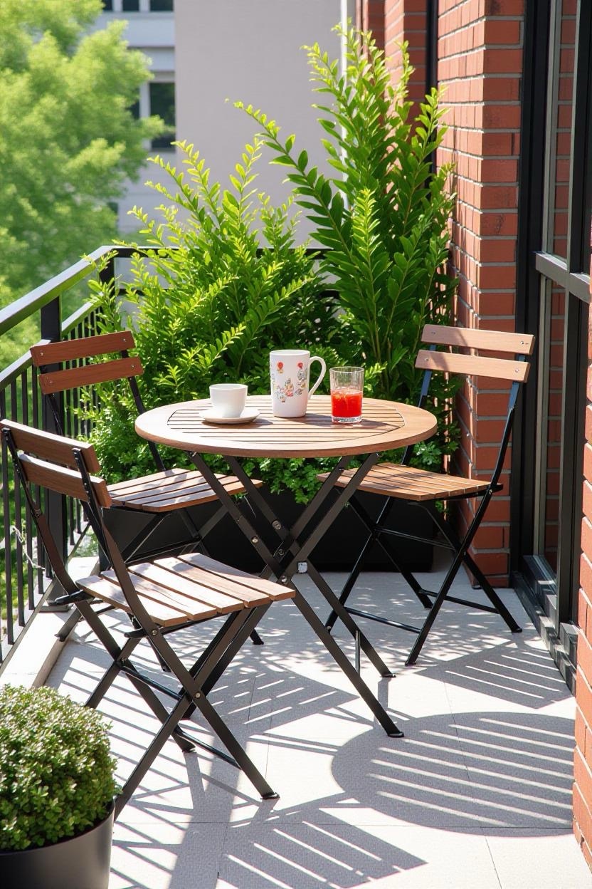 Include a foldable bistro table and chairs for cozy meals outdoors. It’s a simple way to enjoy morning coffee or evening dinners with a view.