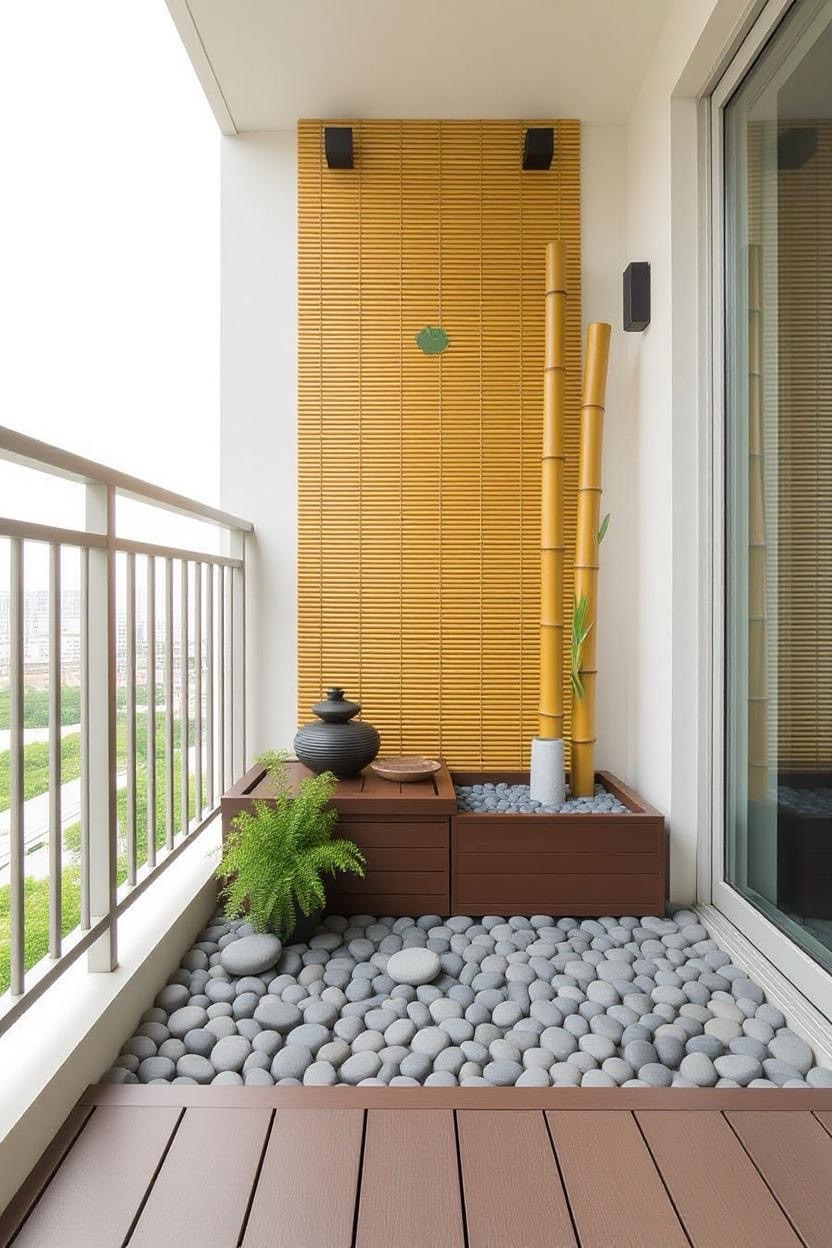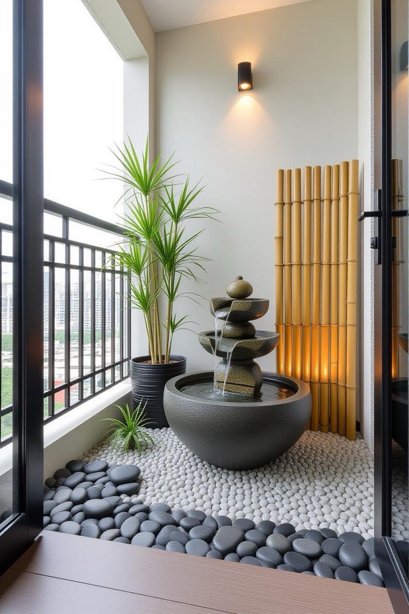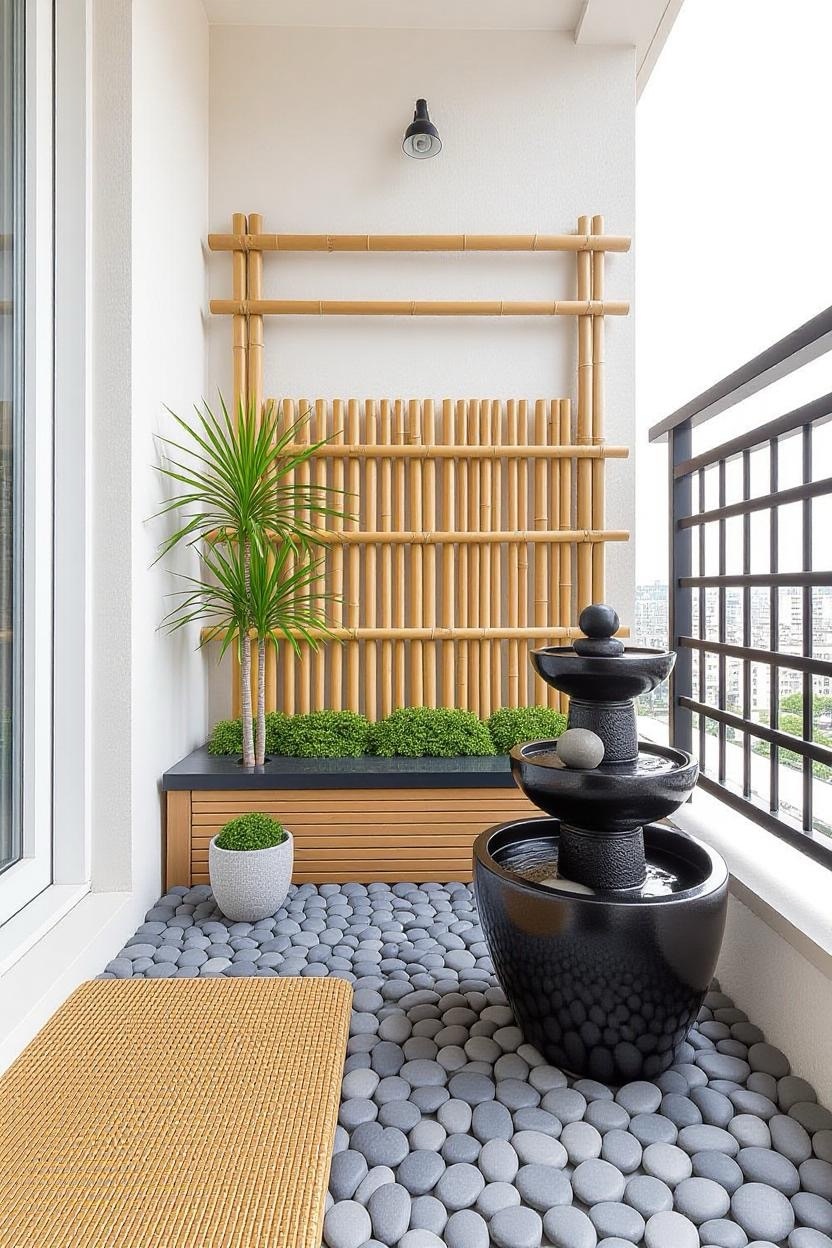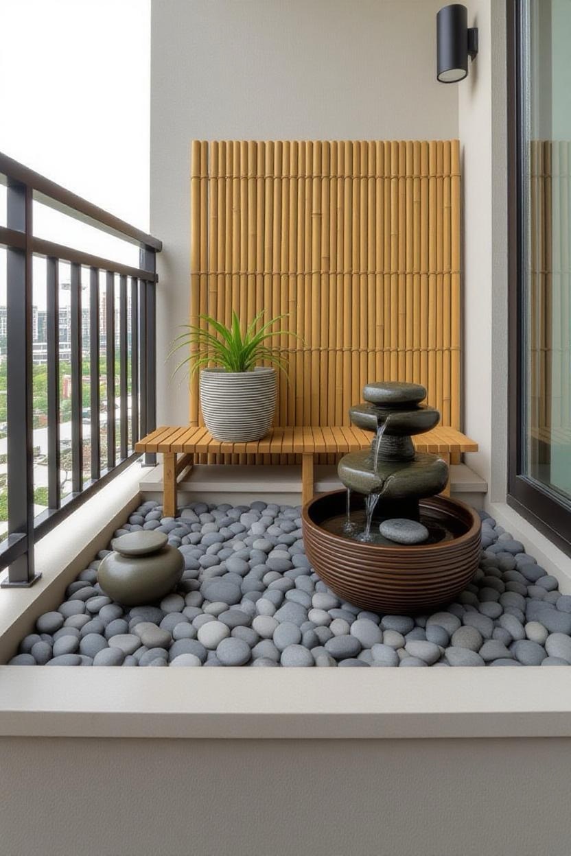 Incorporate small pebbles, bamboo decor, and a tabletop fountain to create a tranquil balcony inspired by Zen design.