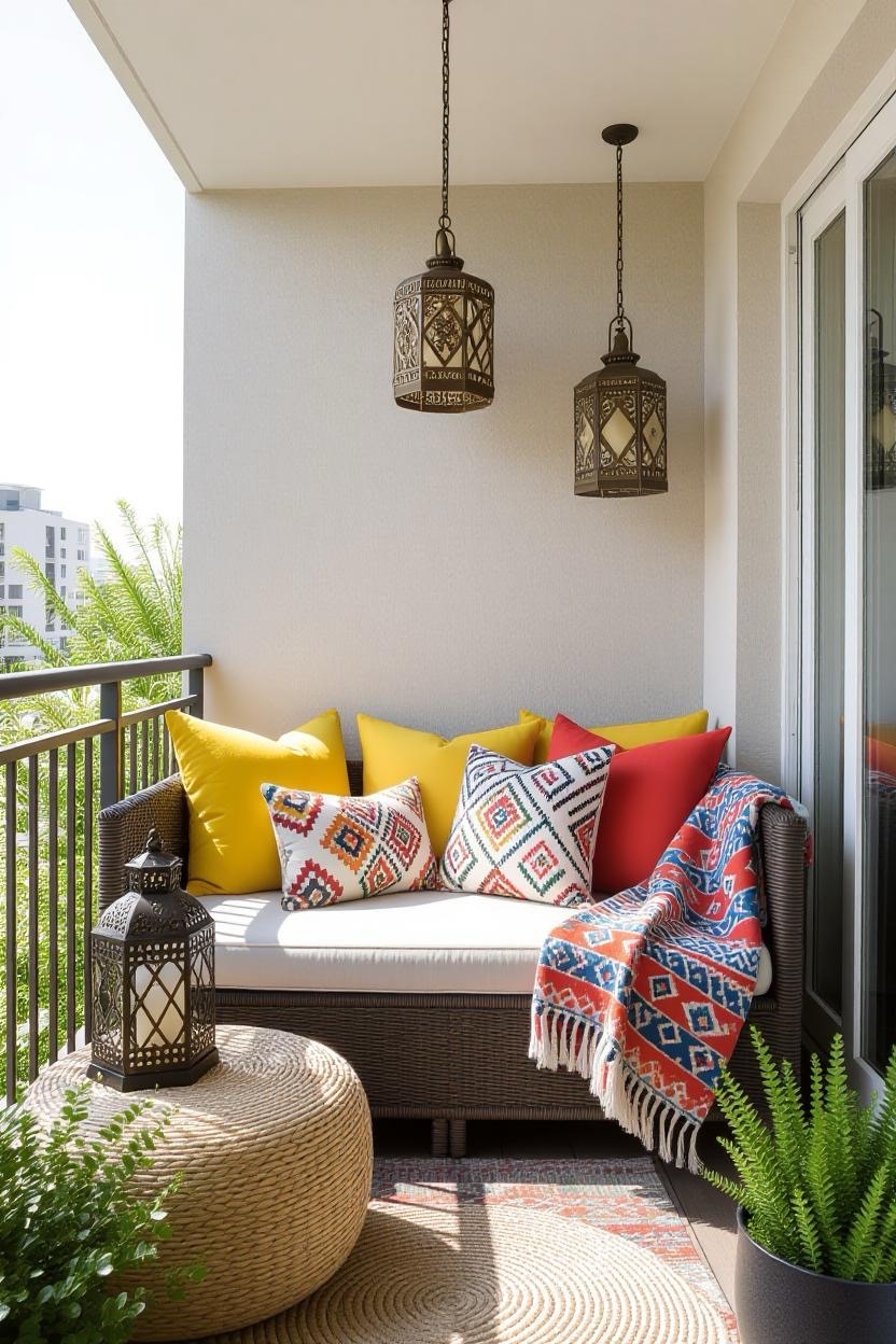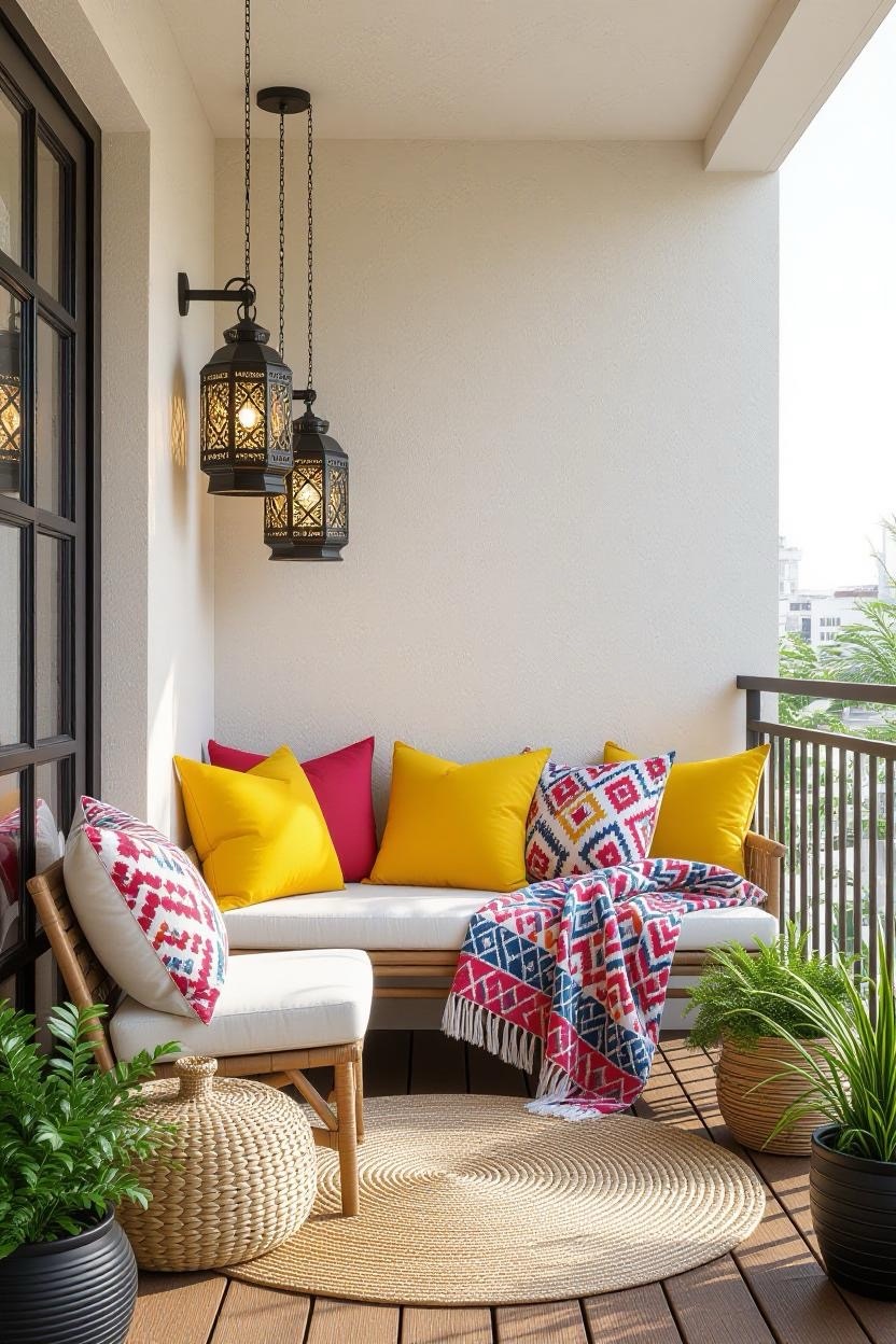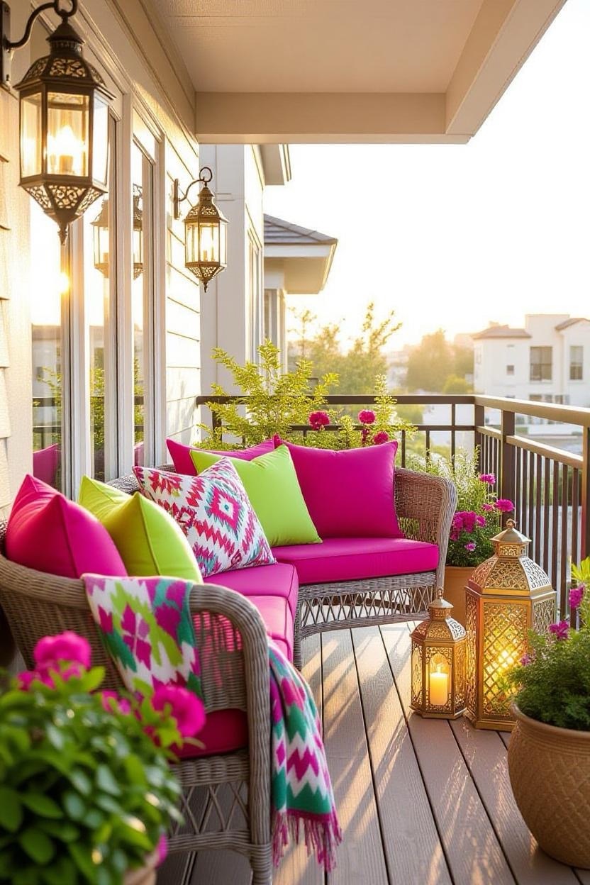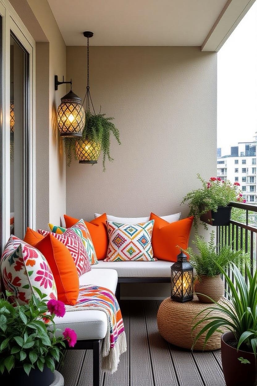 Bright cushions, patterned throws, and eclectic lanterns can transform your balcony into a lively, boho-inspired retreat.