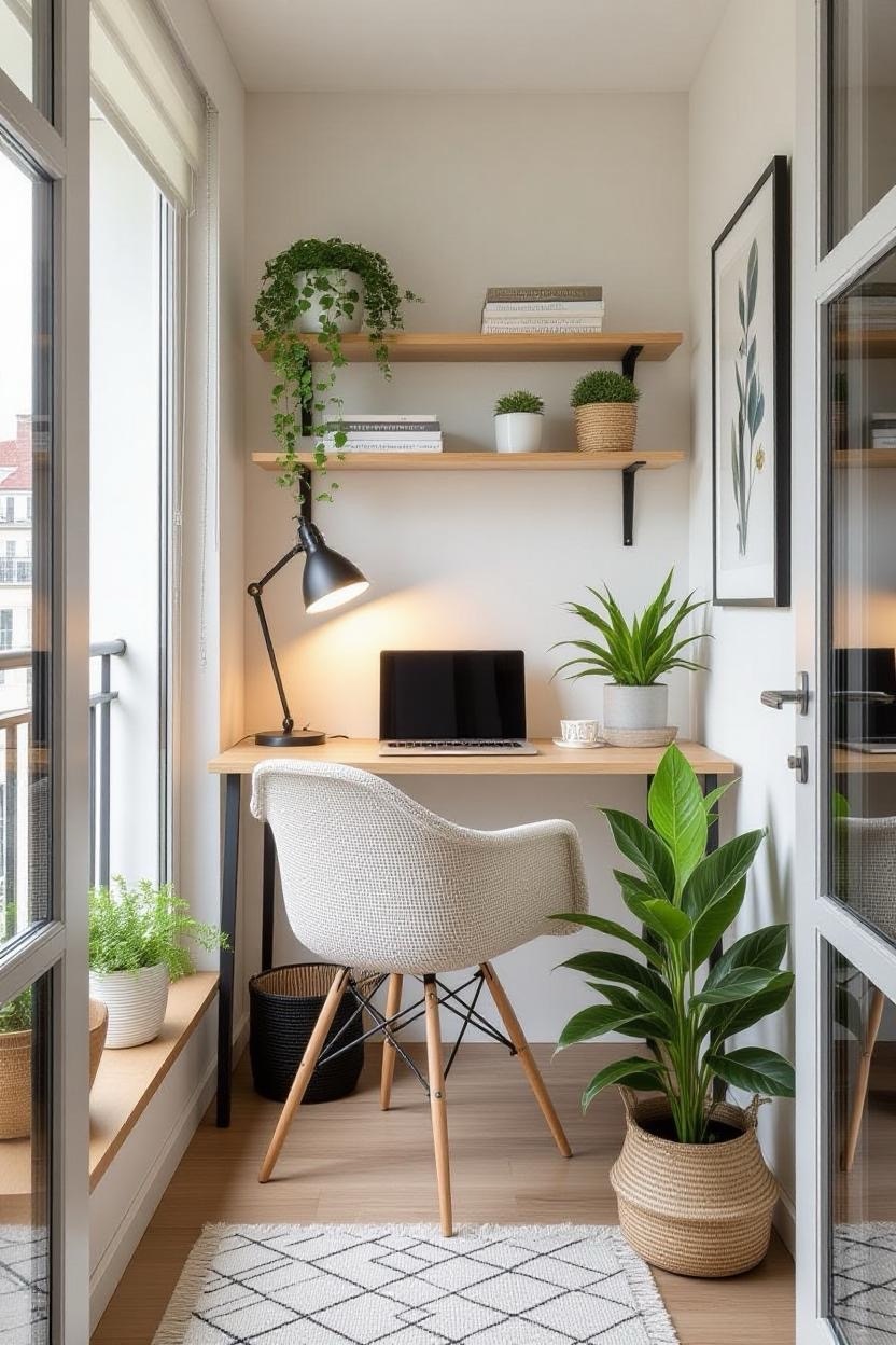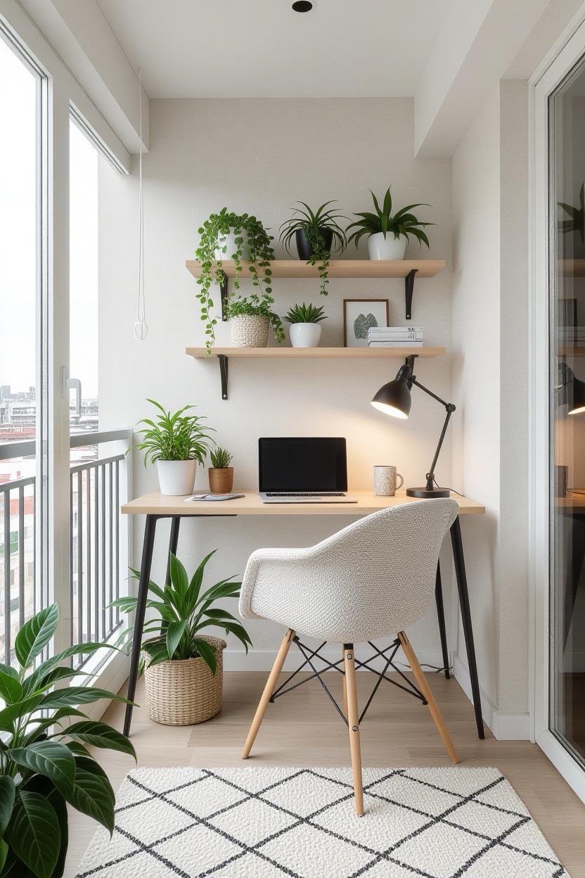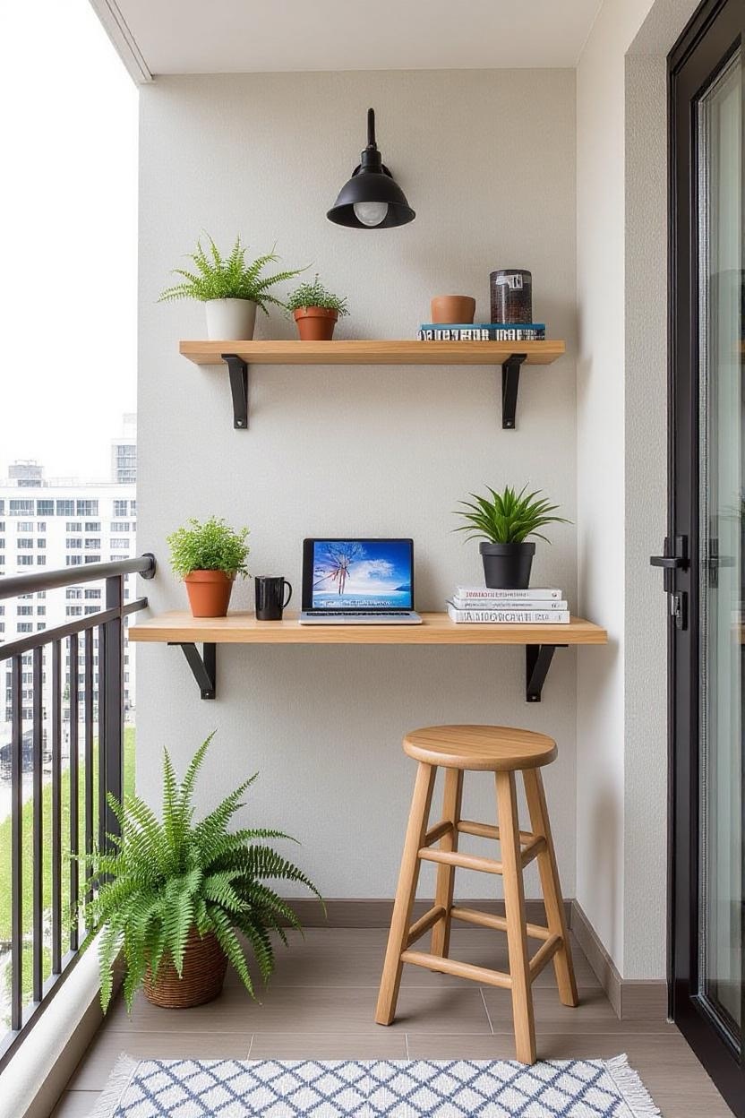 Transform your balcony into a mini office with a slim desk and chair. Add plants for freshness and good lighting for productivity.