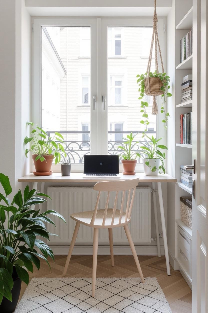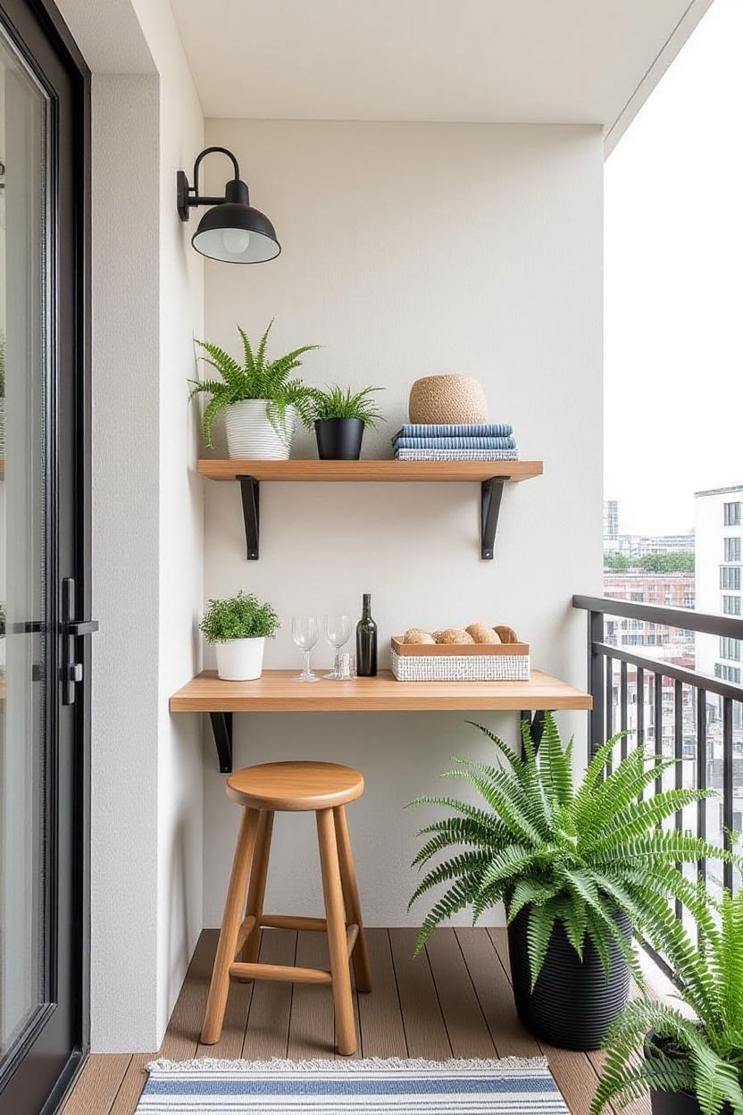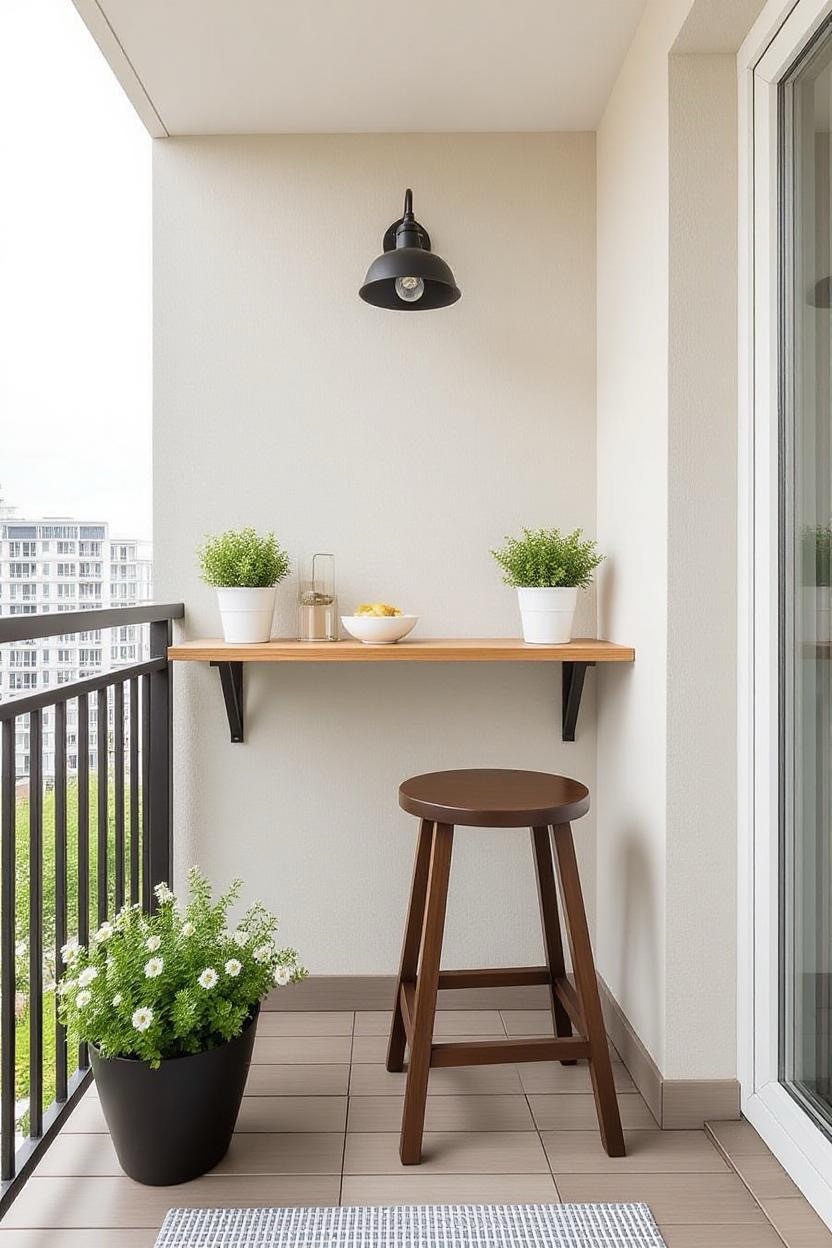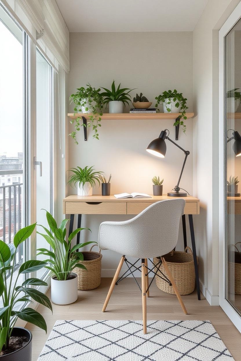 Transform your balcony into a mini office with a slim desk and chair. Add plants for freshness and good lighting for productivity.