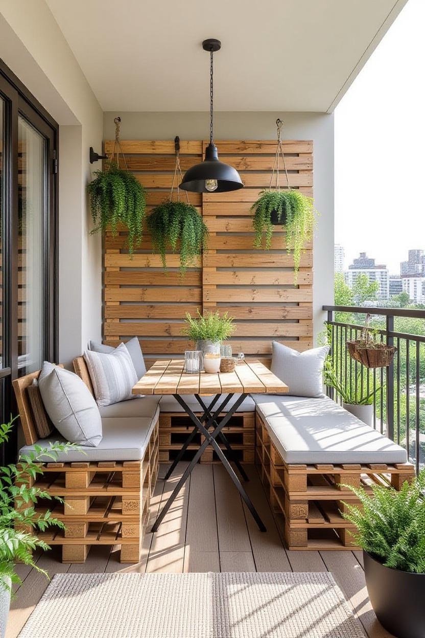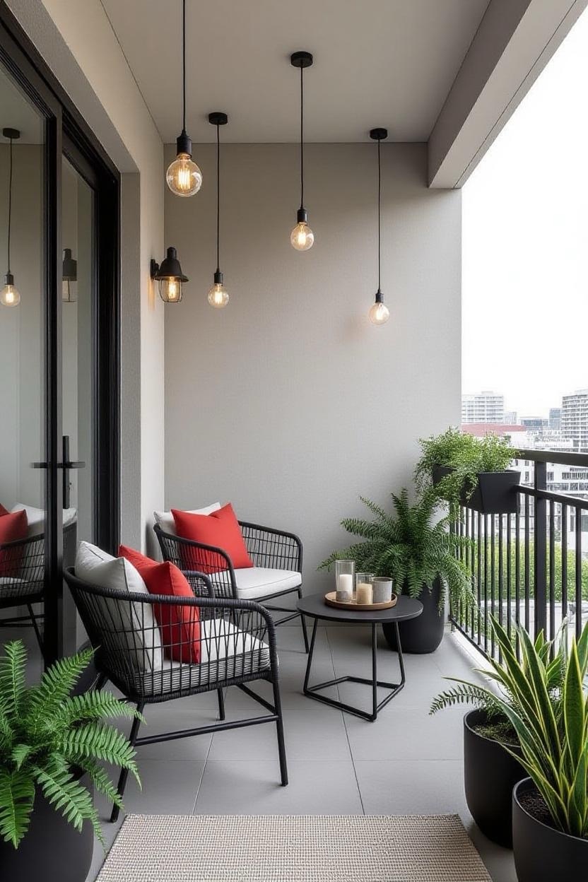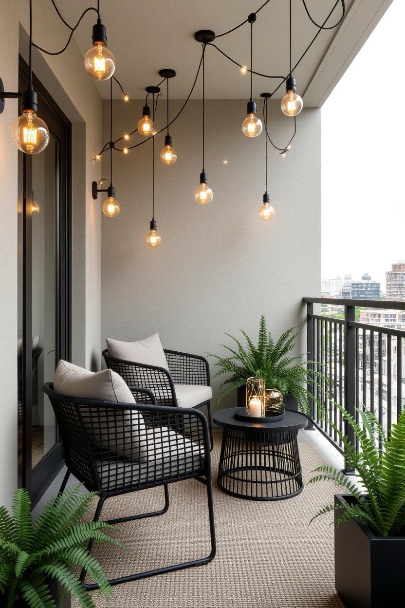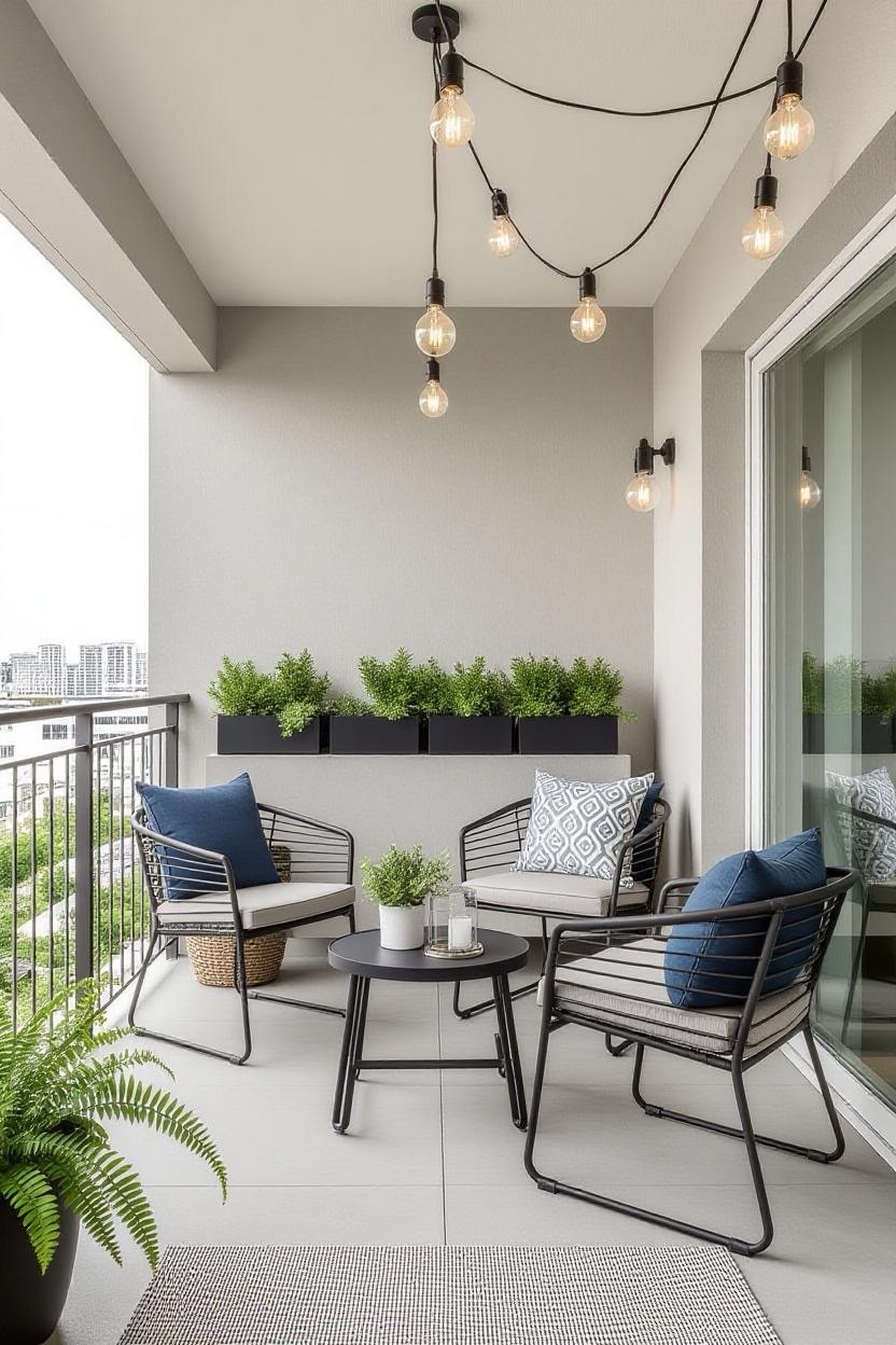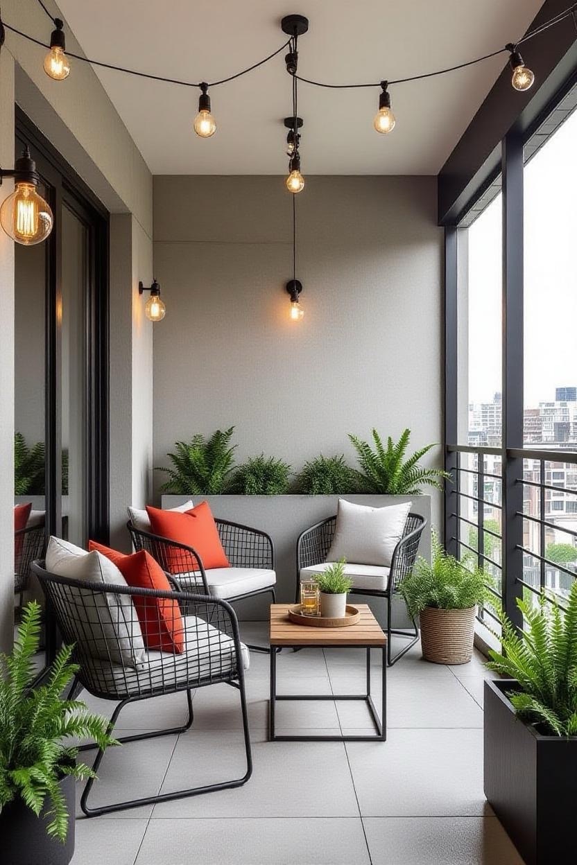 Incorporate metal furniture, concrete accents, and Edison bulb lighting for a modern, industrial-inspired balcony.