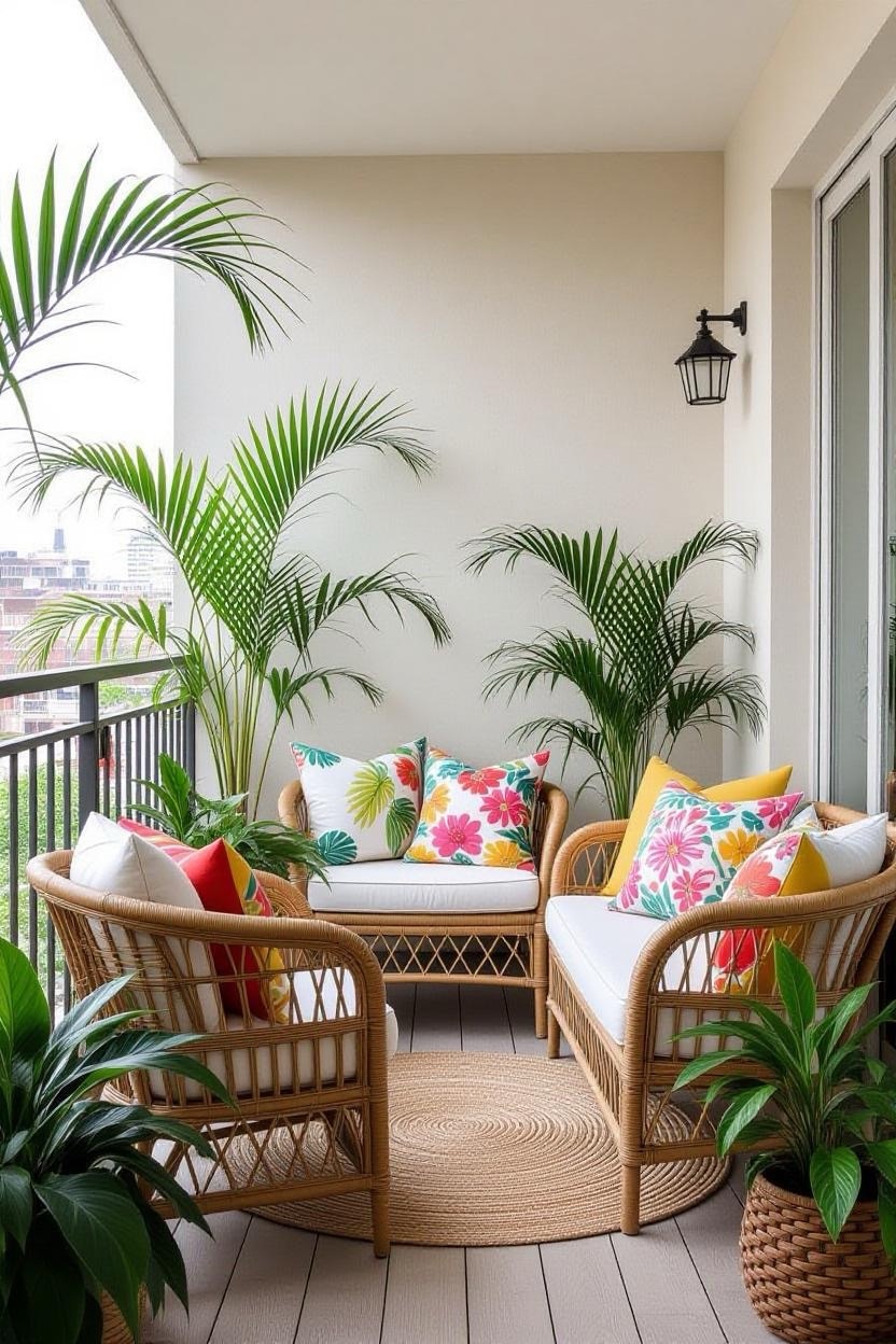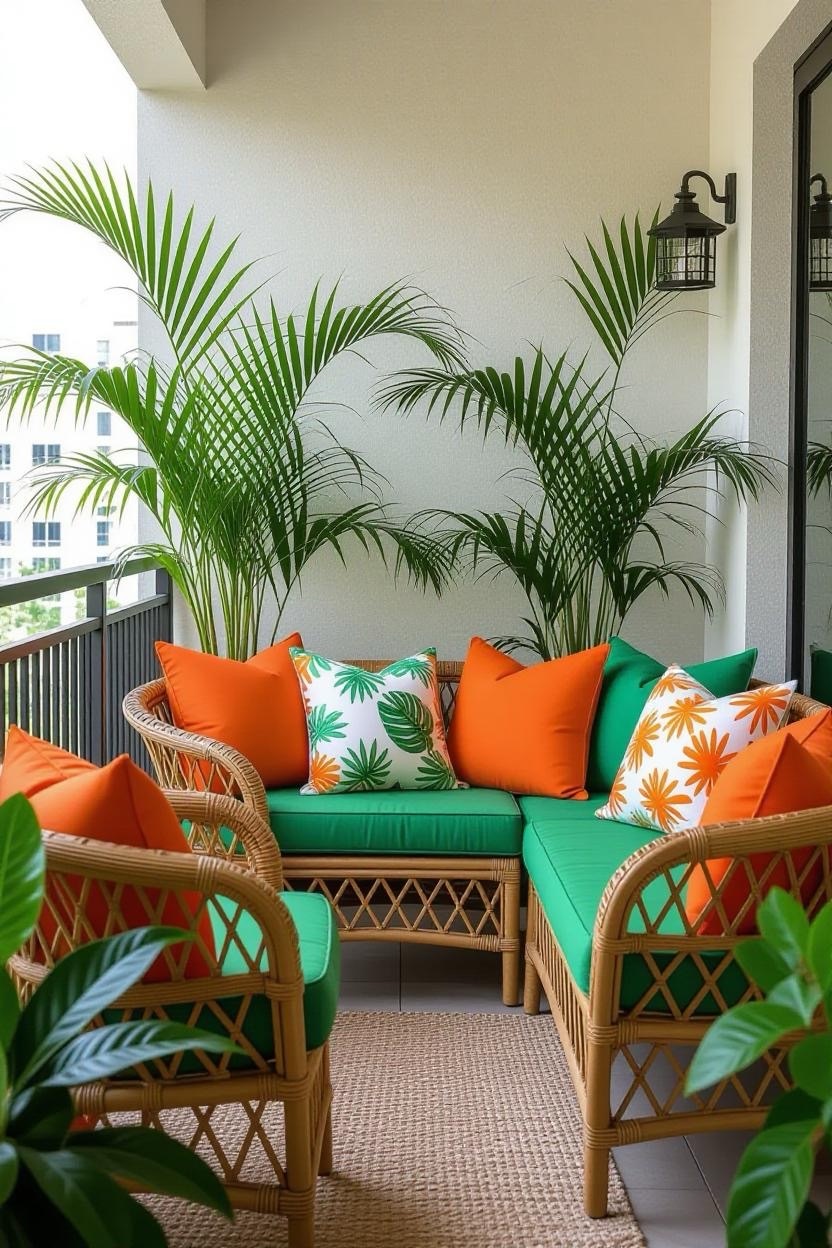 Decorate with palm plants, colorful cushions, and rattan furniture for a vacation-like tropical vibe.