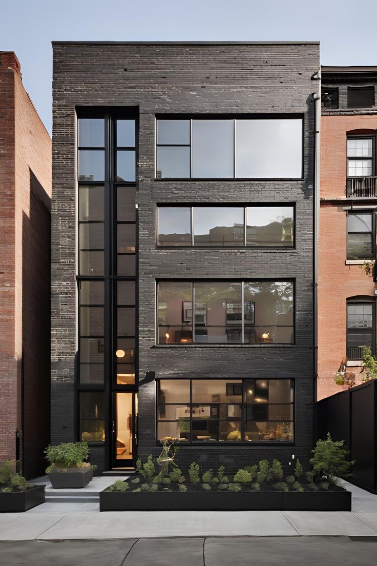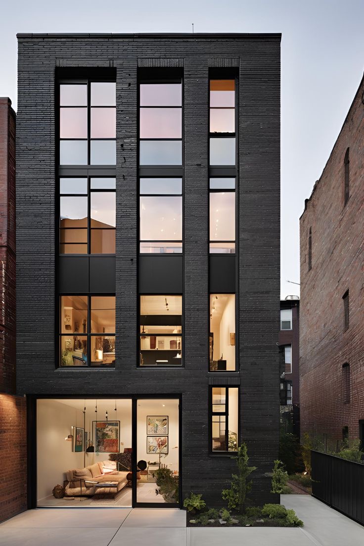 A modern loft glows—black brick walls rise with floor-to-ceiling glass windows; the sleek facade pops against a city backdrop, drawing eyes with its bold, urban curb appeal.