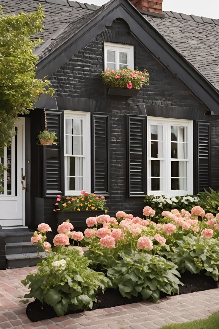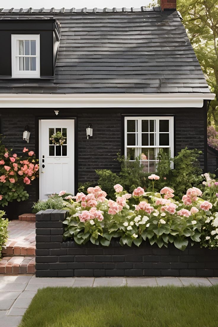 A cottage charms—black brick pairs with crisp white trim around windows; a blooming flower bed softens the dark facade, creating a cozy yet striking curb appeal.
