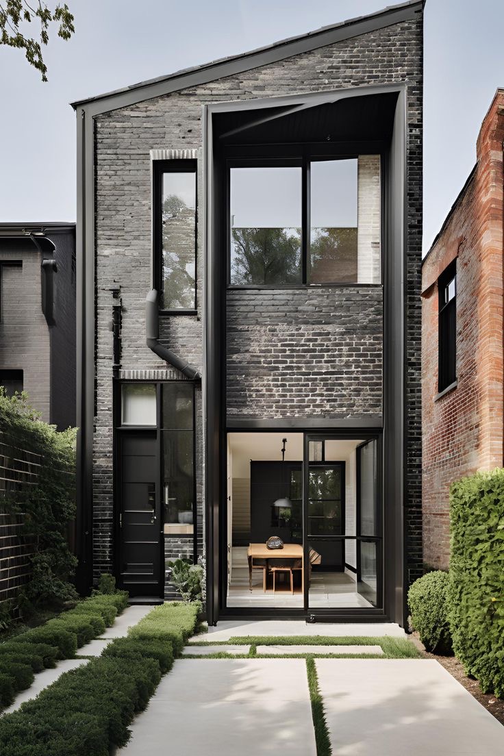 An industrial home stuns—black brick meets sleek metal window frames; a minimalist lawn frames the facade, enhancing its gritty, modern curb appeal with a raw edge.