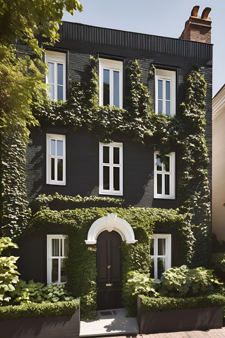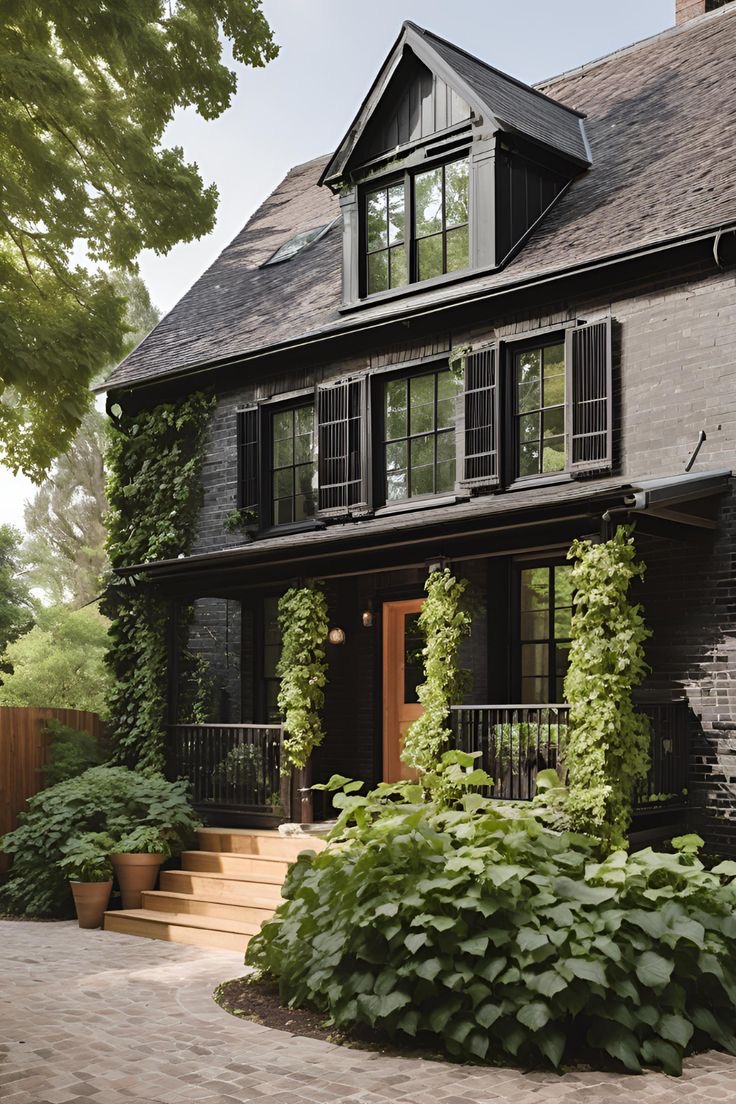 A villa shines—black brick contrasts with white window frames; climbing ivy trails over the facade, blending the dark design with greenery for elegant curb appeal.