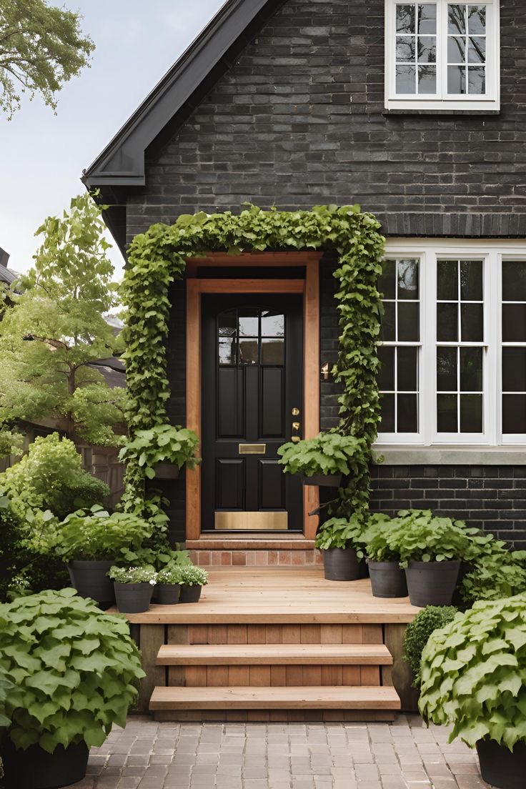 A farmhouse stands tall—black brick contrasts with a warm wooden porch; climbing ivy adds a green touch, blending rustic charm with bold curb appeal.