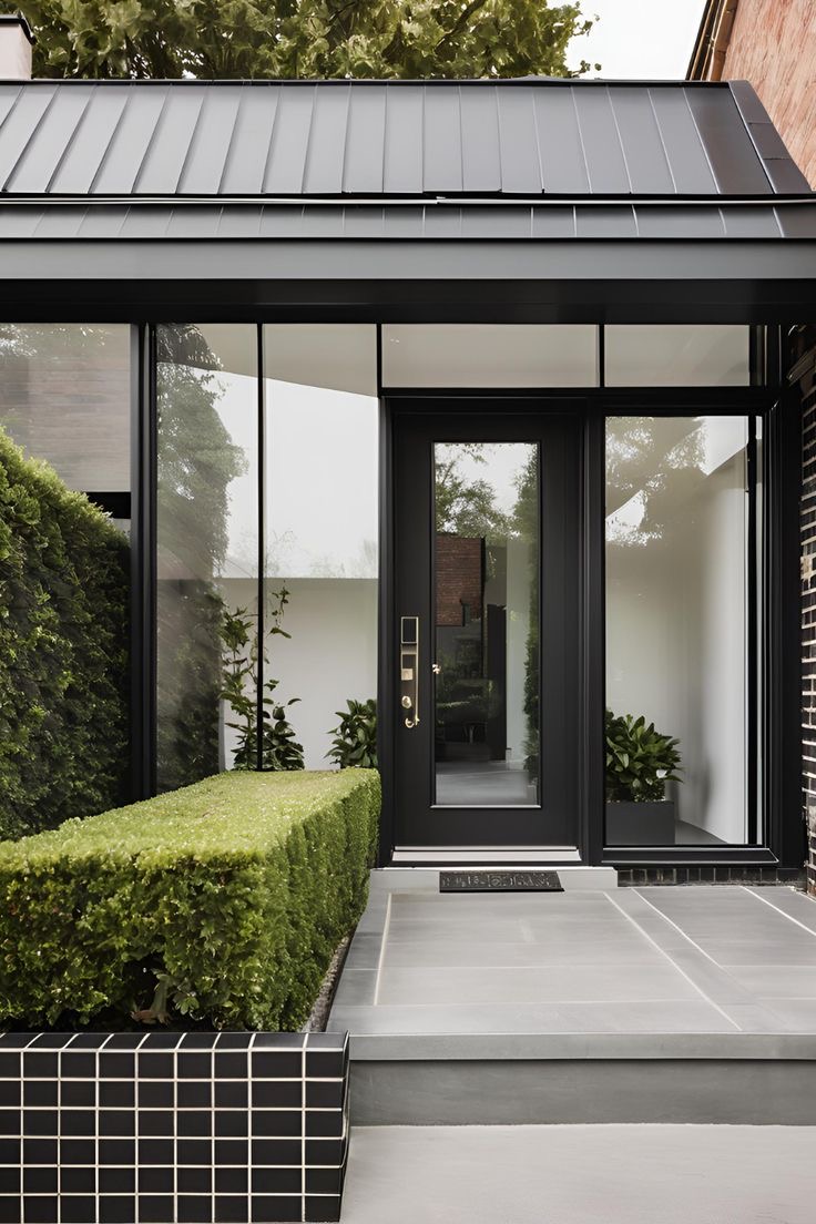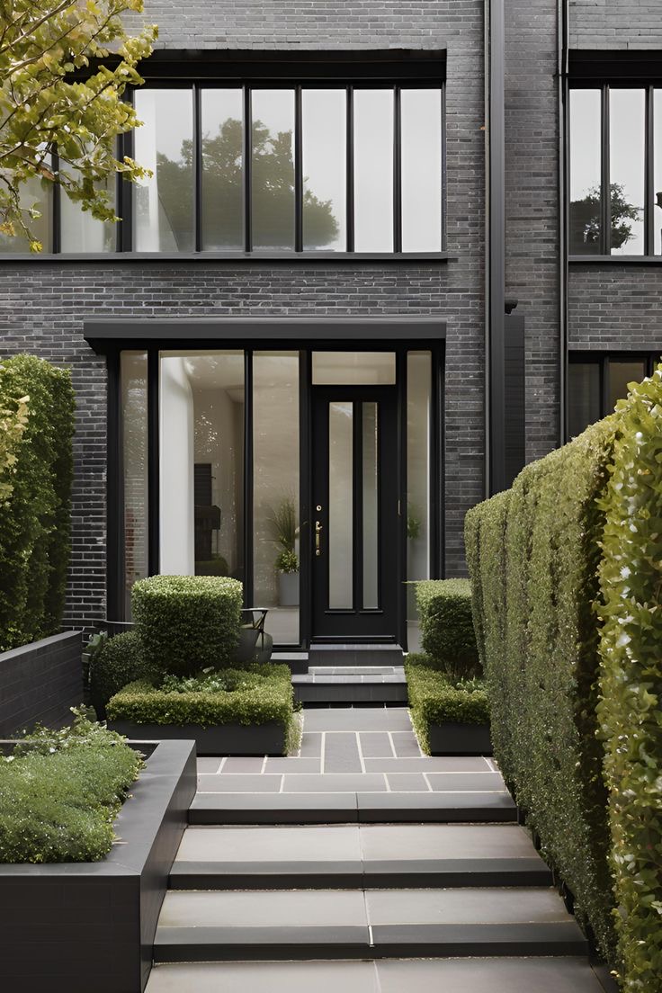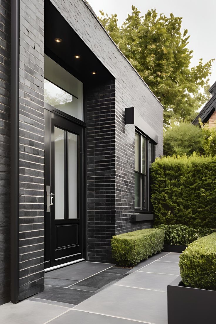 A contemporary villa shines—black brick walls frame a glass front door; manicured shrubs line the entry, creating a sleek, inviting curb appeal with modern flair.