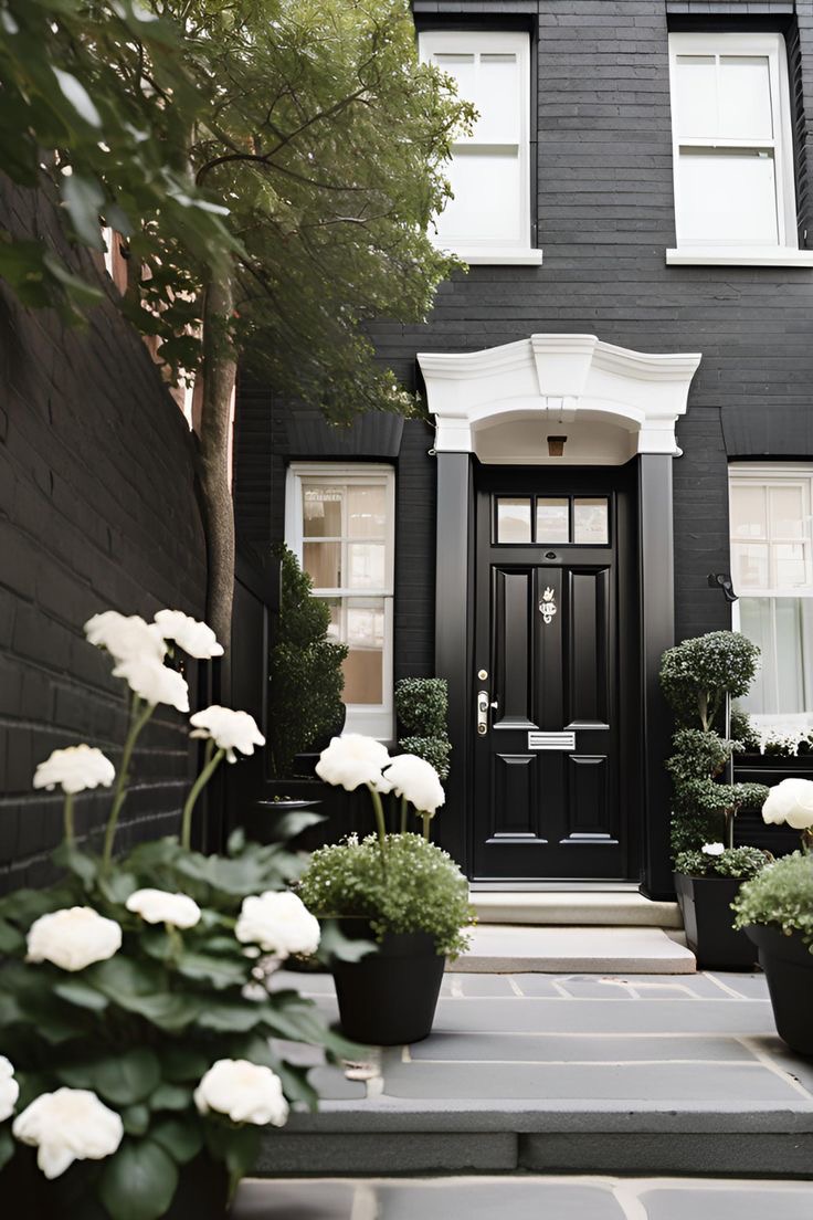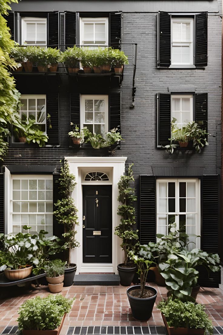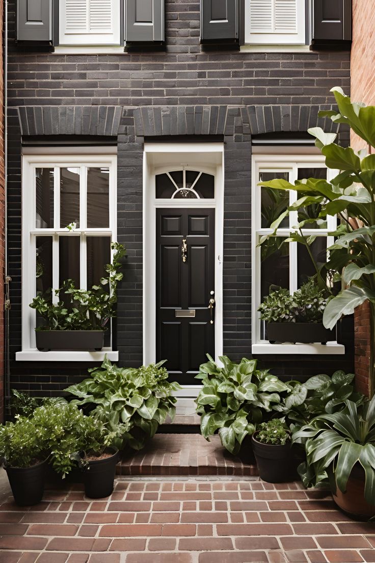 A townhouse glows—black brick pairs with white shutters on tall windows; potted plants flank the door, softening the dark facade for a classic curb appeal.