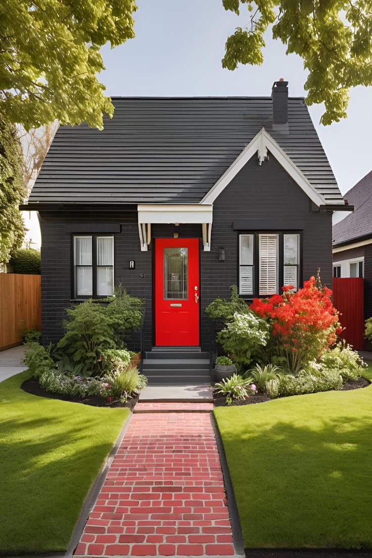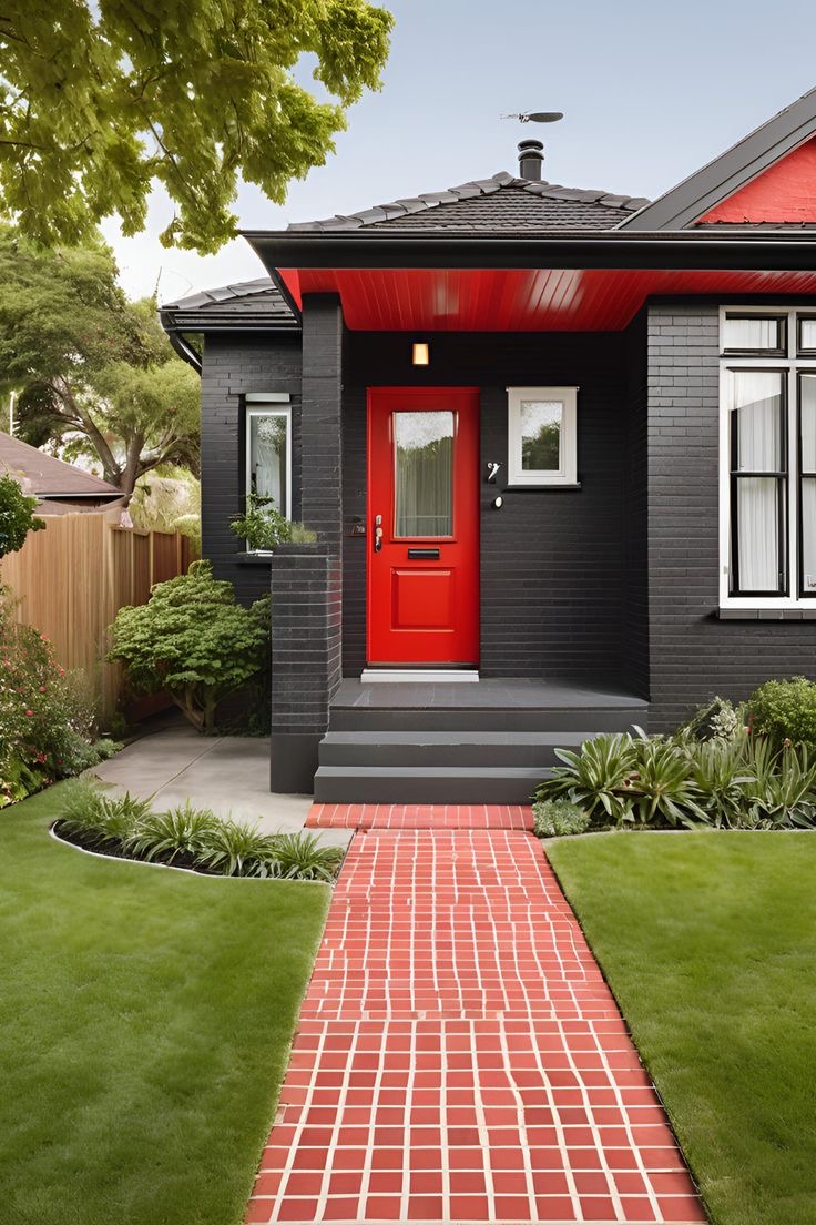 A bungalow pops—black brick meets a vibrant red front door; a lush lawn frames the facade, adding a playful yet sophisticated curb appeal to the design.