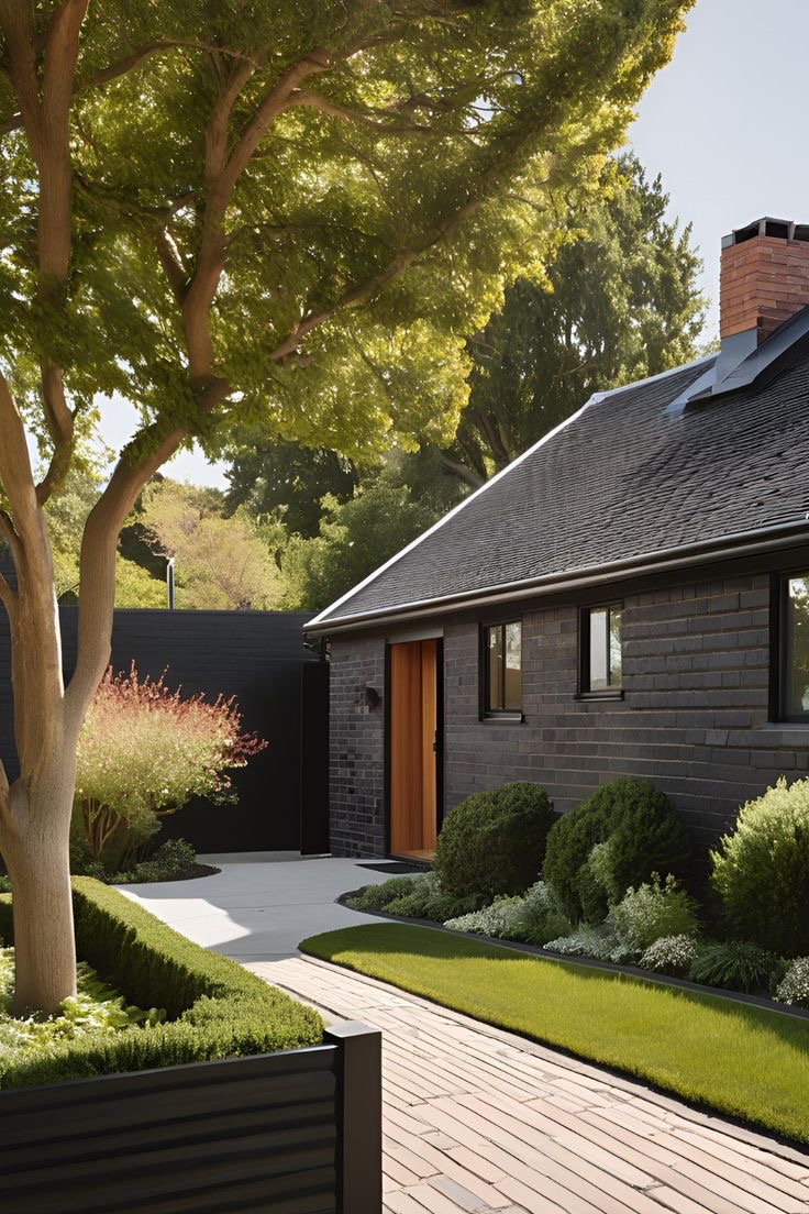 A ranch sprawls—black brick walls contrast with a cedar roofline; low hedges border the front, enhancing the dark facade with natural warmth and curb appeal.