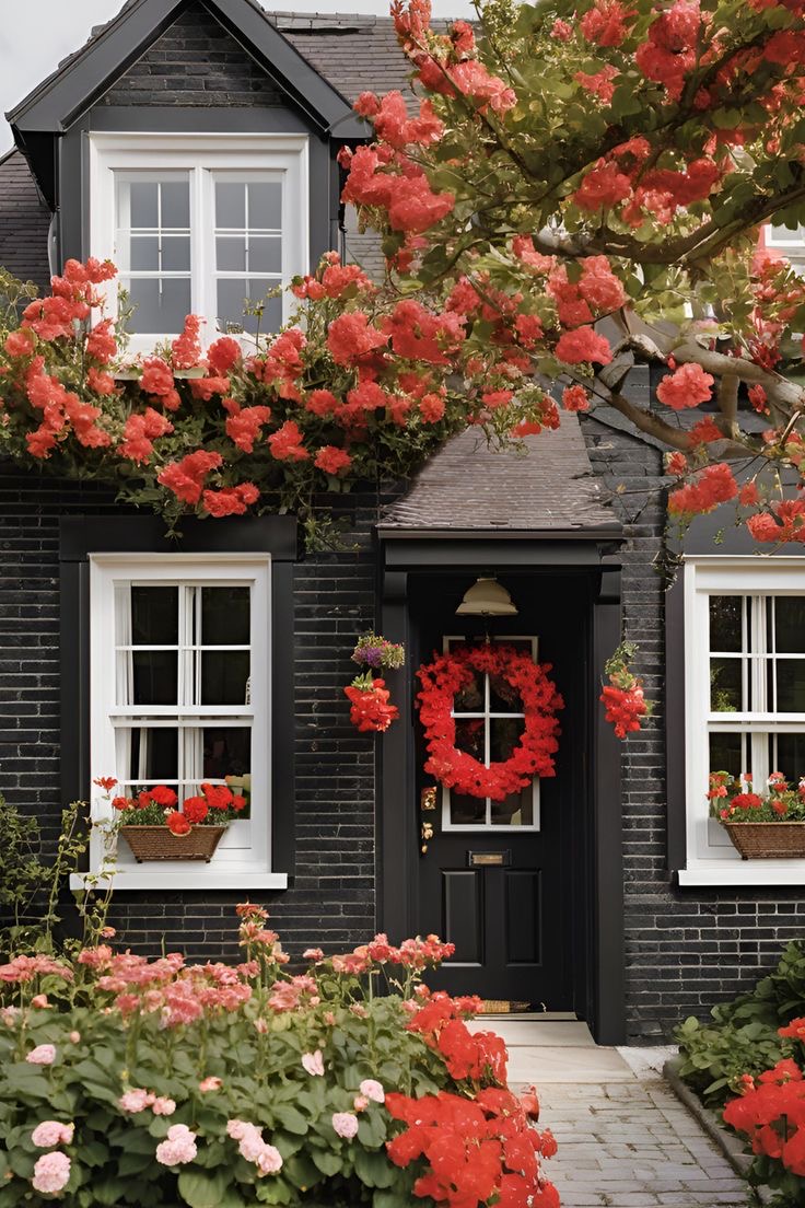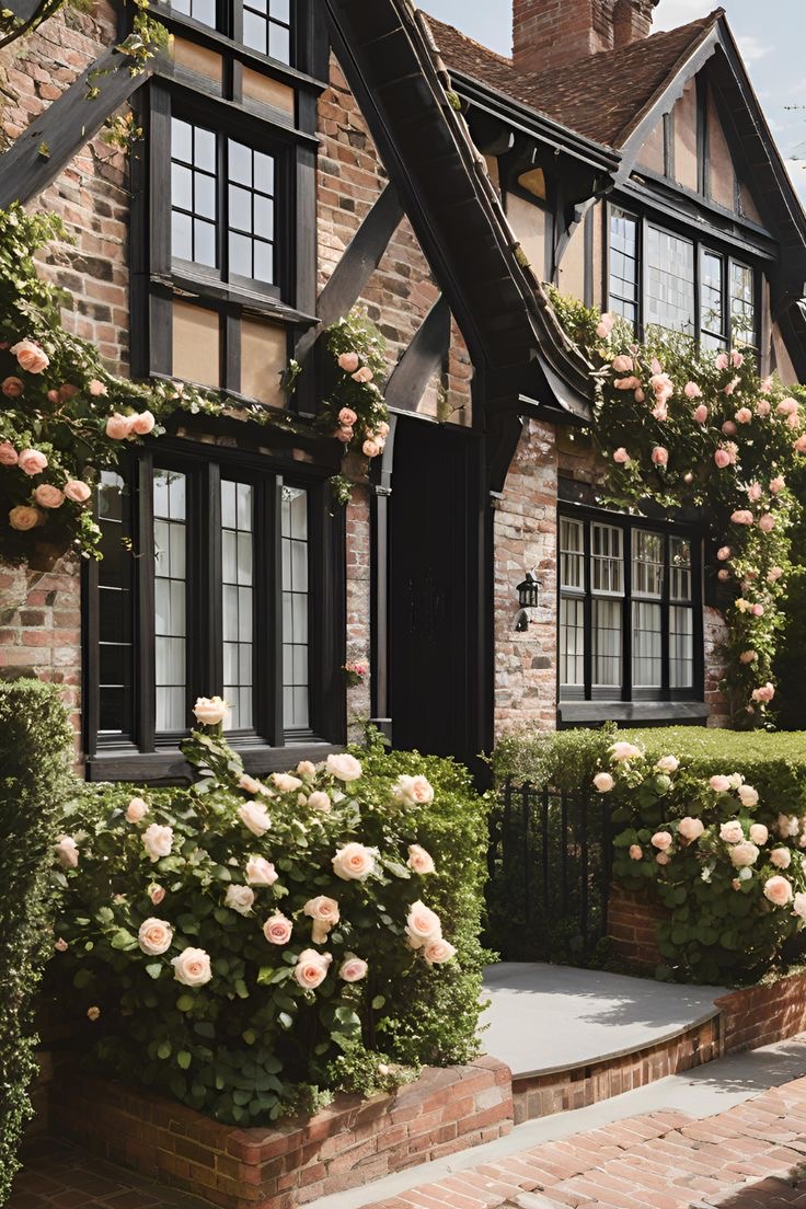 A Tudor home stuns—black brick pairs with exposed wooden beams; climbing roses trail over the facade, blending classic style with dramatic curb appeal.