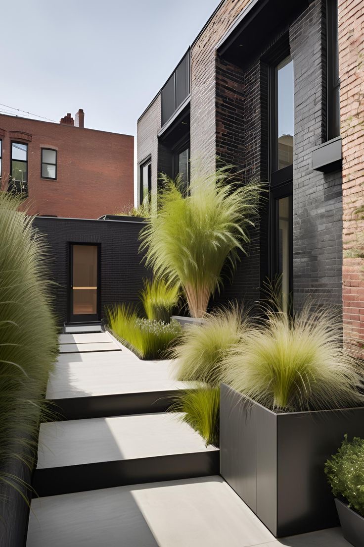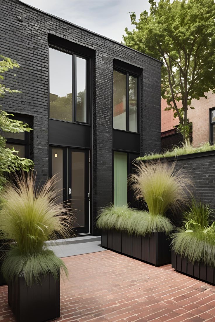 A loft rises—black brick walls lead to a rooftop terrace; tall grasses in planters frame the base, adding a modern, green curb appeal to the urban design.