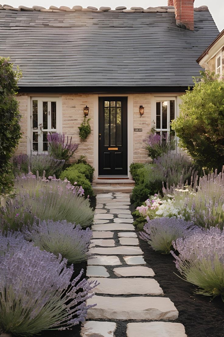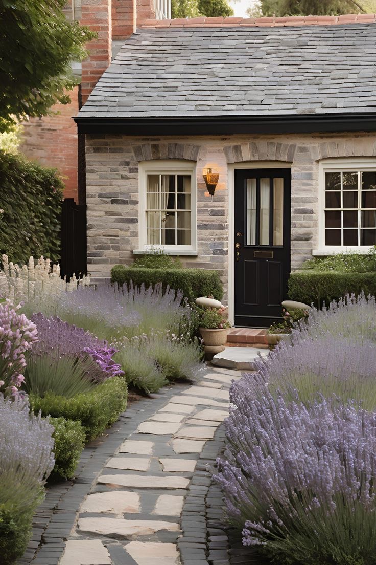 A cottage charms—black brick glows with a stone path leading to the door; blooming lavender lines the walkway, softening the dark facade with quaint curb appeal.