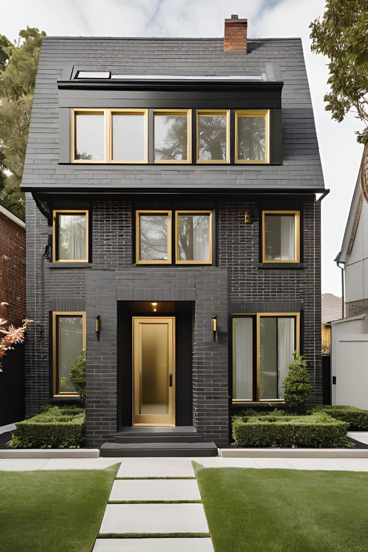 A modern home shines—black brick meets gold window trim; a sleek lawn frames the facade, creating a luxurious curb appeal with a bold, elegant contrast.