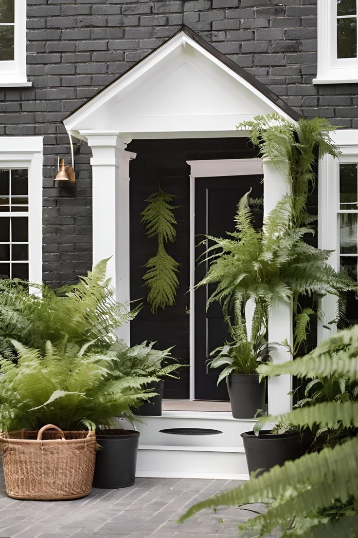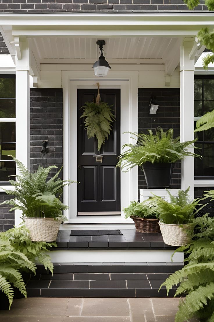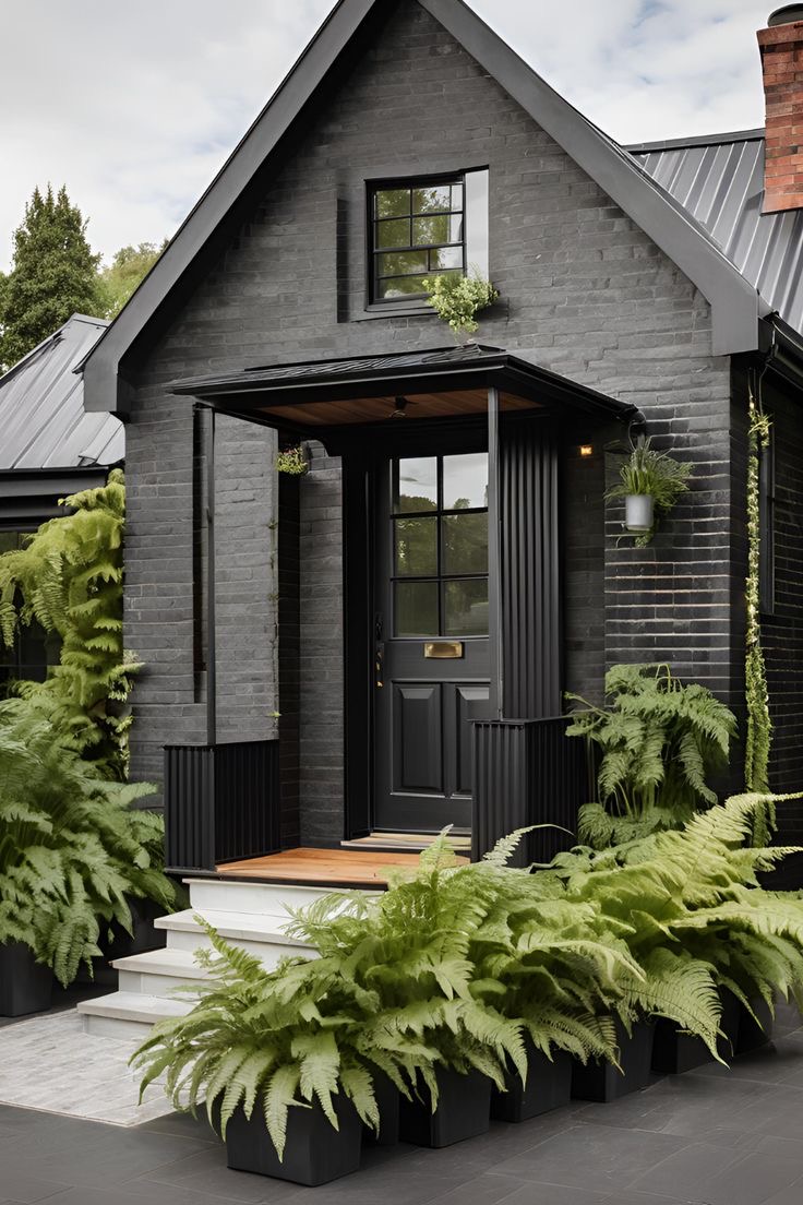 A farmhouse stands tall—black brick pairs with a sleek metal roof; a row of ferns lines the front, creating a modern-rustic curb appeal with a dark twist.