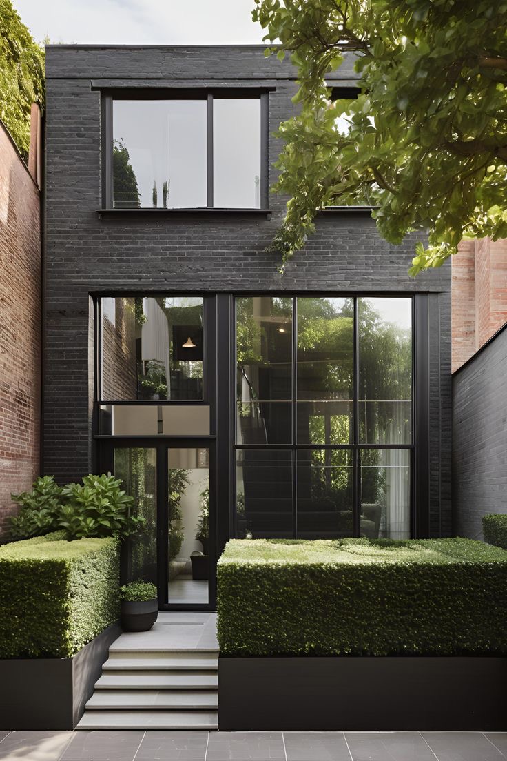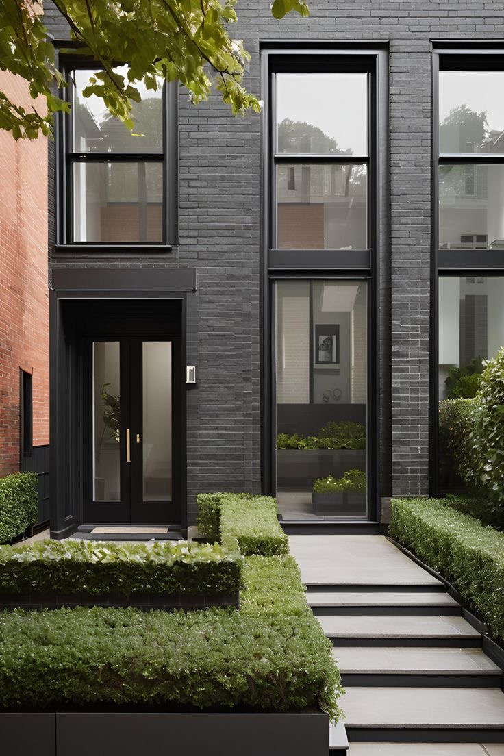 A townhouse glows—black brick frames a glass entryway; manicured shrubs line the base, softening the dark facade with a modern, inviting curb appeal.