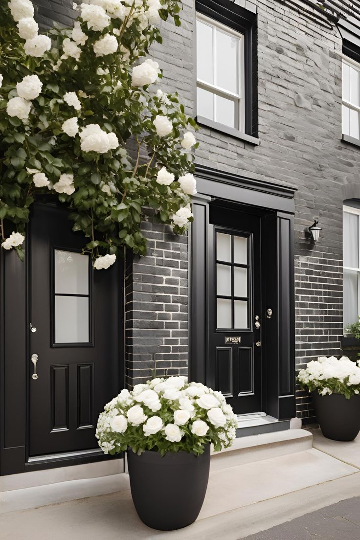 A townhouse stands out—black brick meets a matching black front door; white flowers in pots soften the look, creating a sleek, monochromatic curb appeal.