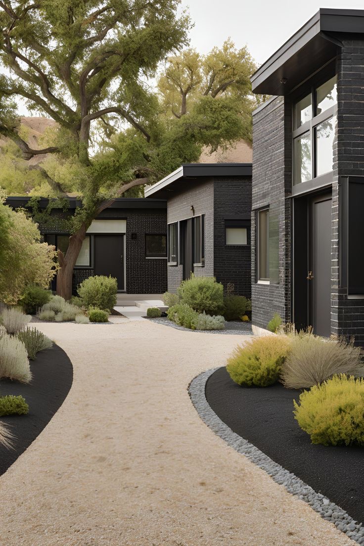 A ranch sprawls—black brick contrasts with a gravel driveway; low shrubs border the facade, enhancing the dark design with a natural, earthy curb appeal.