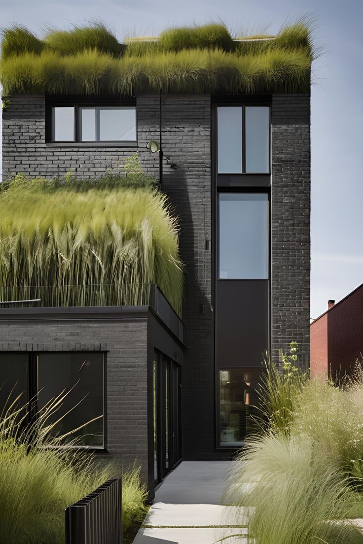 A modern loft rises—black brick walls lead to a green roof; tall grasses grow below, blending the dark facade with eco-friendly curb appeal.