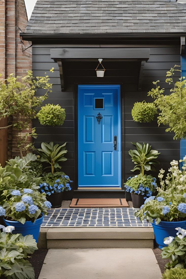A cottage charms—black brick meets a bright blue front door; potted plants flank the entry, adding a pop of color and curb appeal to the design.