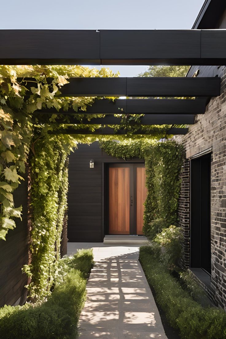 A ranch sprawls—black brick pairs with a wooden pergola over the entry; climbing vines wrap the structure, blending the dark facade with greenery for curb appeal.