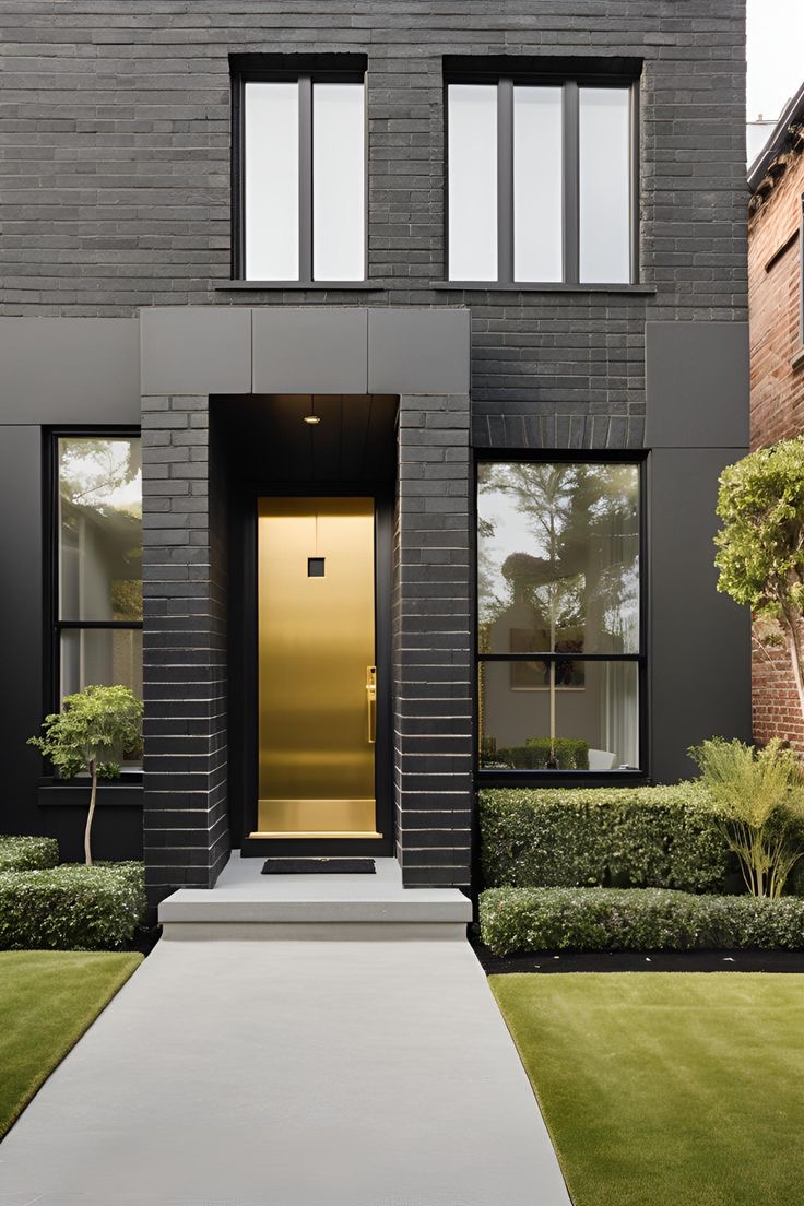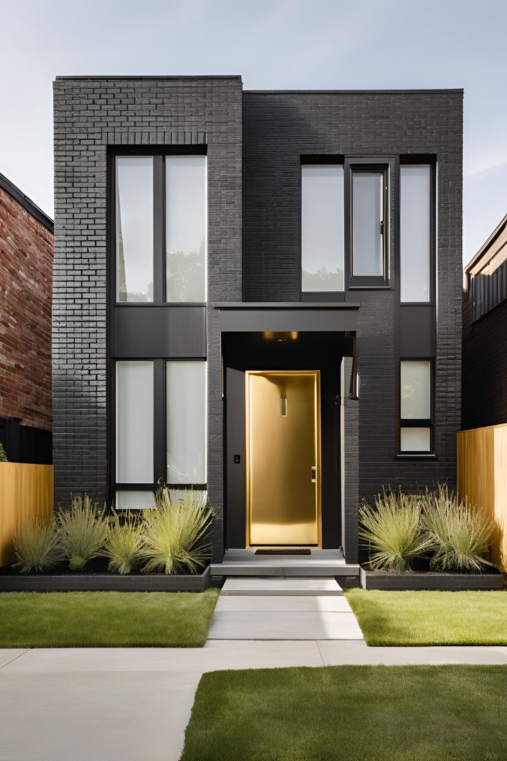 A modern home shines—black brick meets a gold front door; a sleek lawn frames the facade, creating a luxurious curb appeal with a bold, elegant contrast.