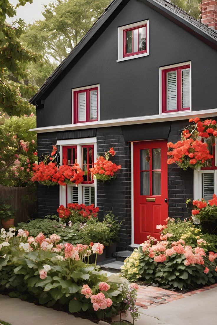 A cottage charms—black brick pairs with red shutters on the windows; blooming flowers line the front, adding a playful, colorful curb appeal to the dark design.