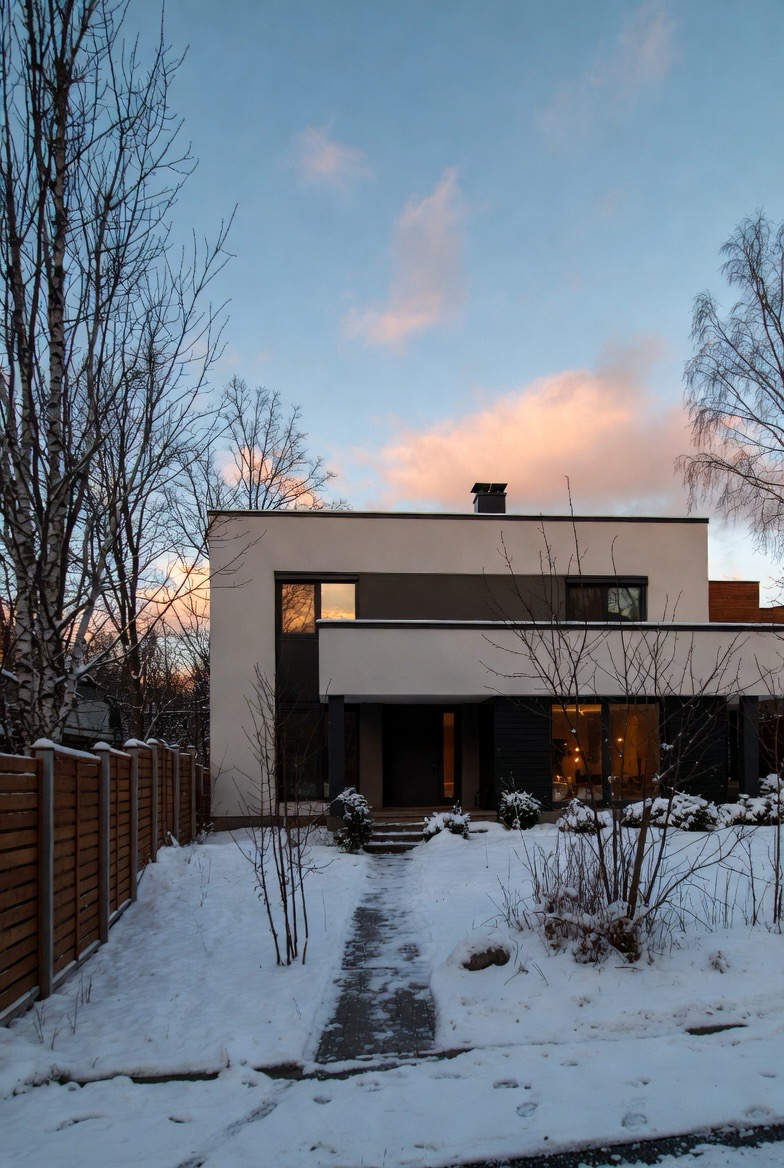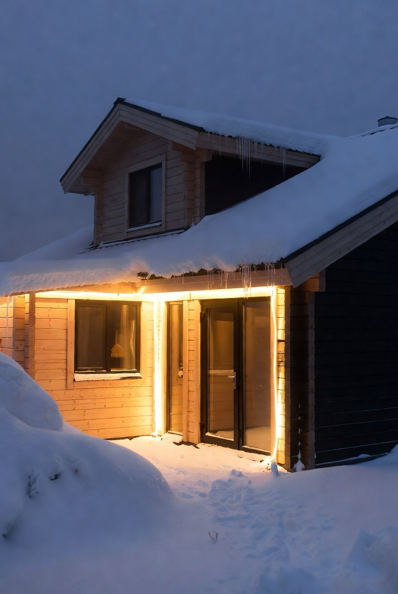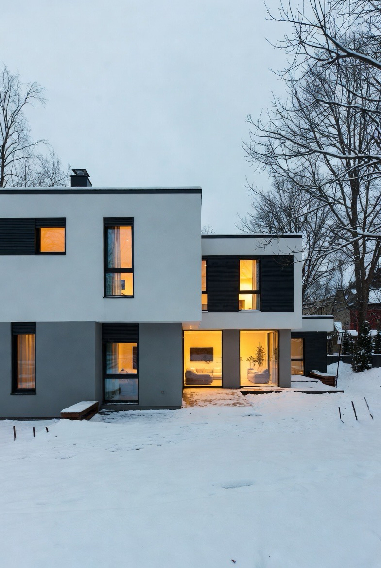 Modern winter exteriors rely on lighting to add warmth. Clean lines, neutral colors, and glowing interior lights create a striking contrast against snow and winter skies.