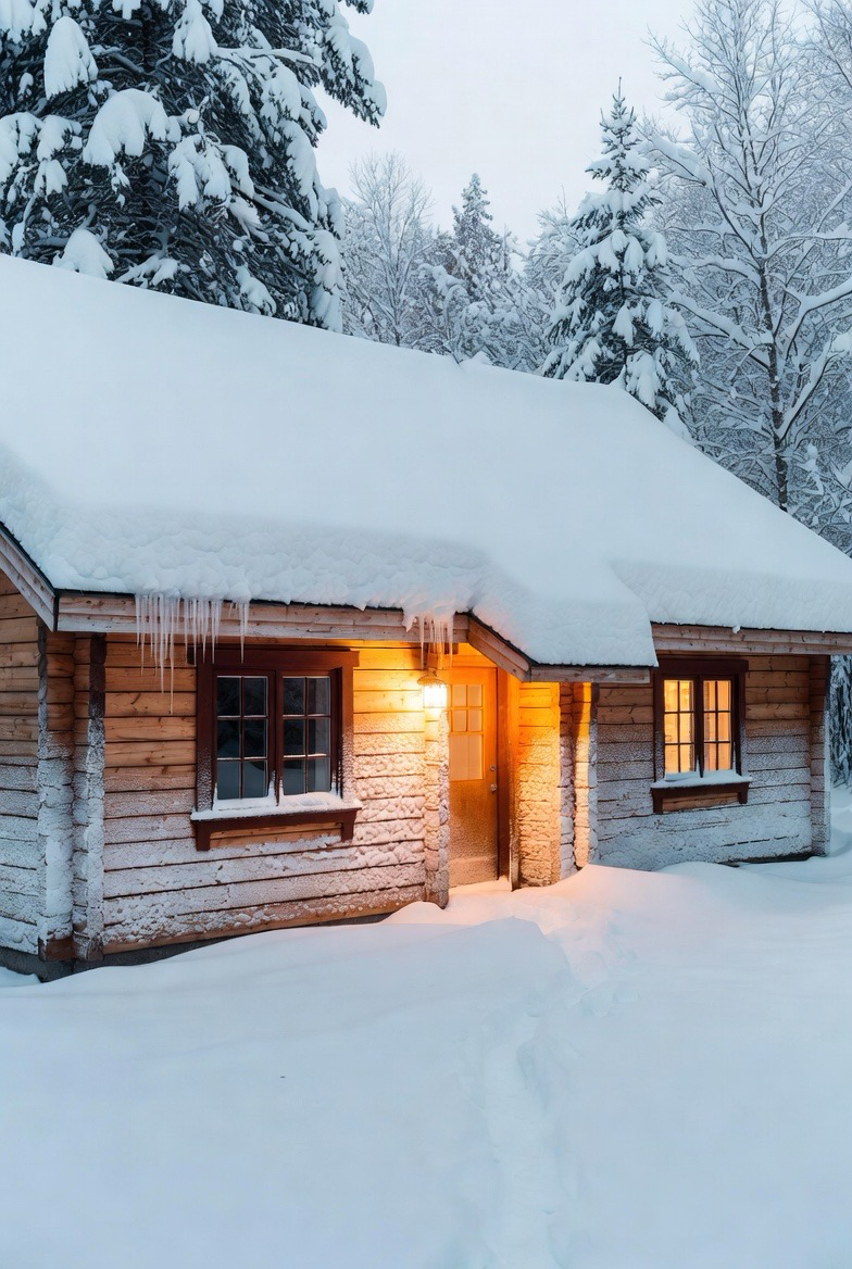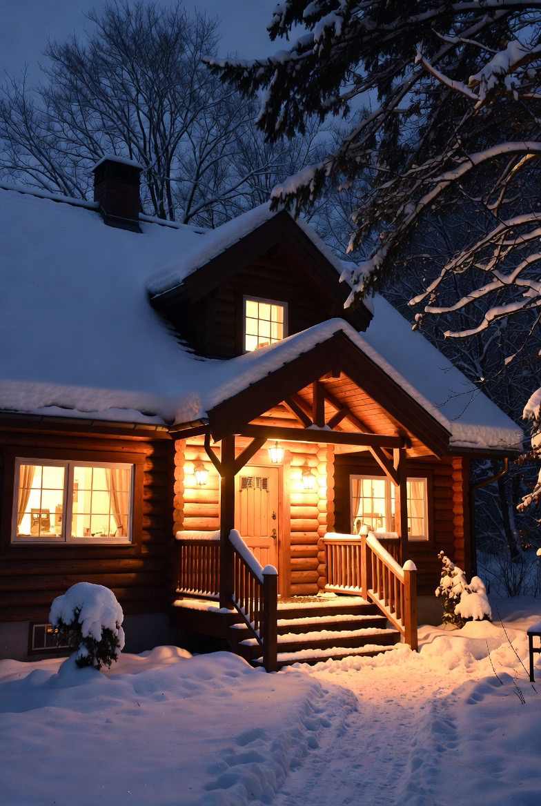 A snow-covered cabin exterior instantly feels magical and timeless. Natural wood siding paired with a pitched roof creates a cozy alpine look that shines in winter. Adding warm outdoor lighting around windows and doors enhances the inviting atmosphere, making the home glow beautifully against snowy surroundings.