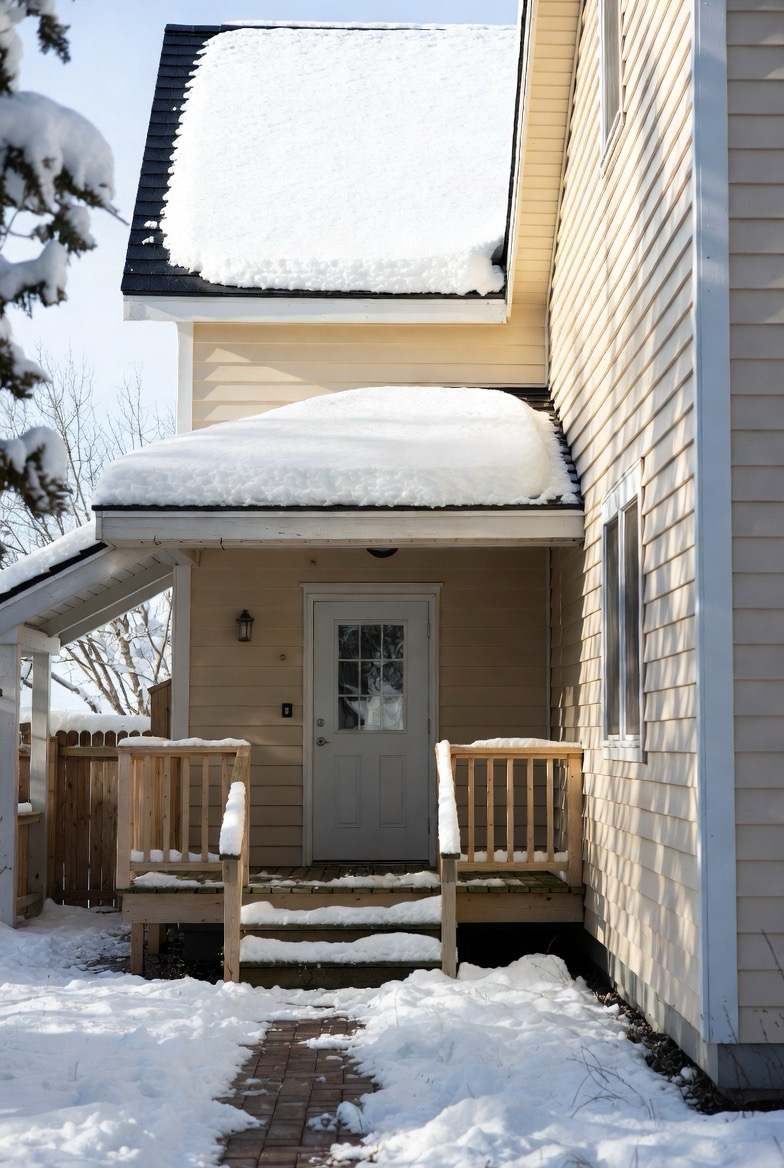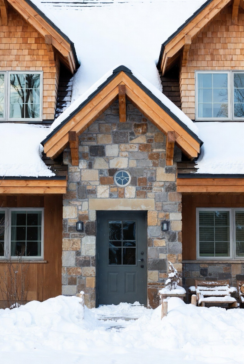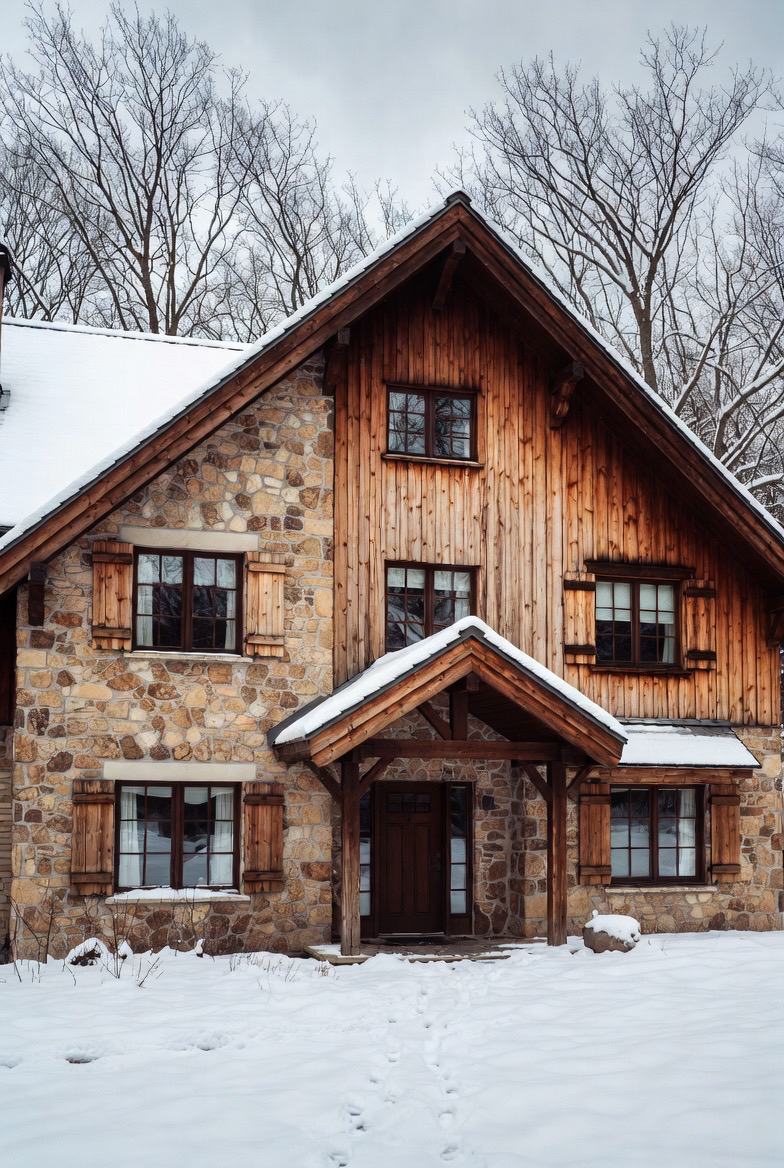 Stone and wood exteriors offer rich texture and warmth during winter. The natural materials contrast beautifully with snow, creating a grounded, rustic appeal. This combination feels sturdy and comforting, perfect for cold-weather curb appeal.