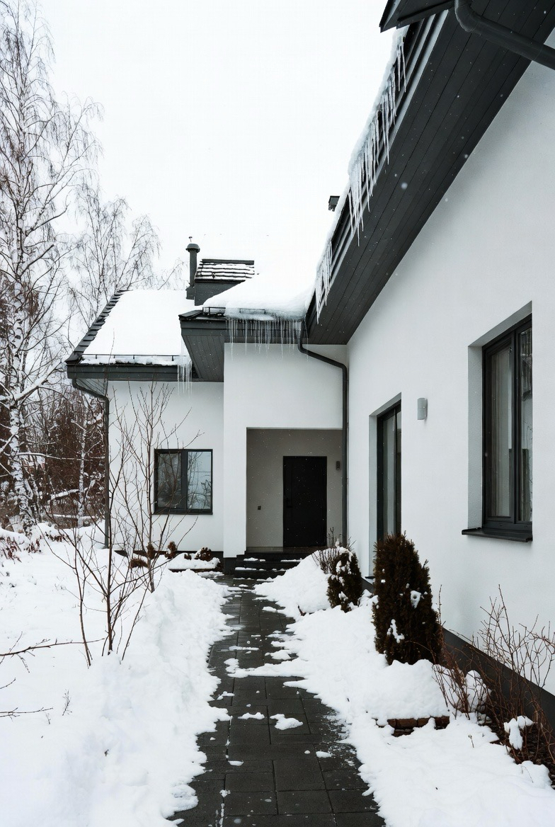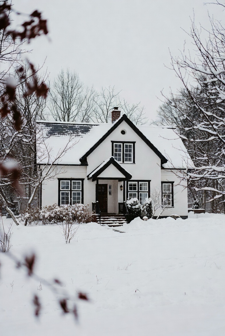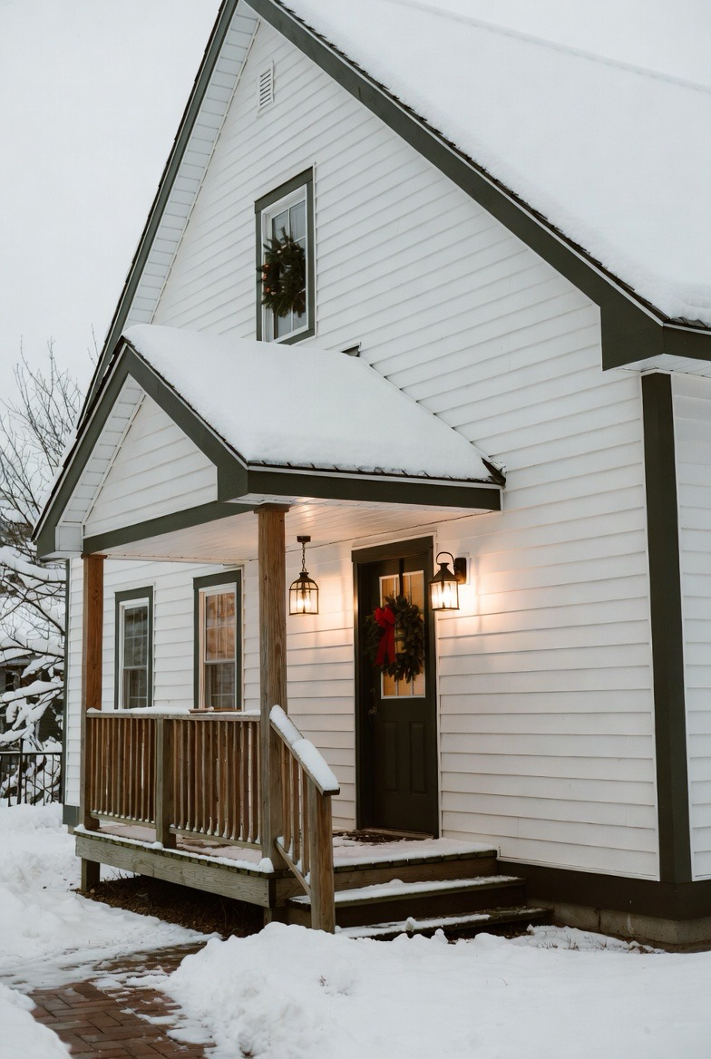 White exteriors paired with dark trim feel crisp and elegant in winter. Snow enhances the contrast, creating a clean, polished look.