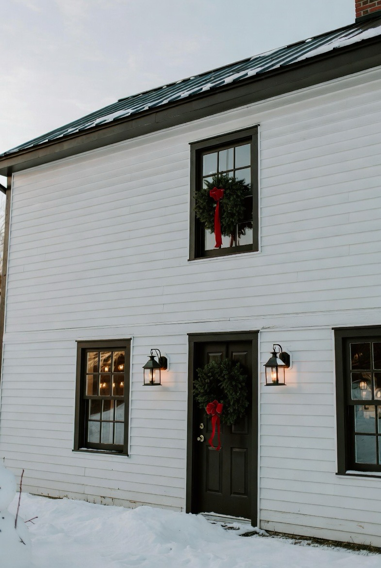 Farmhouse exteriors look especially charming in winter when paired with wreaths, lanterns, and soft lighting. White siding reflects snow beautifully, while dark trim adds contrast. Subtle seasonal décor keeps the look cozy without feeling overdone.