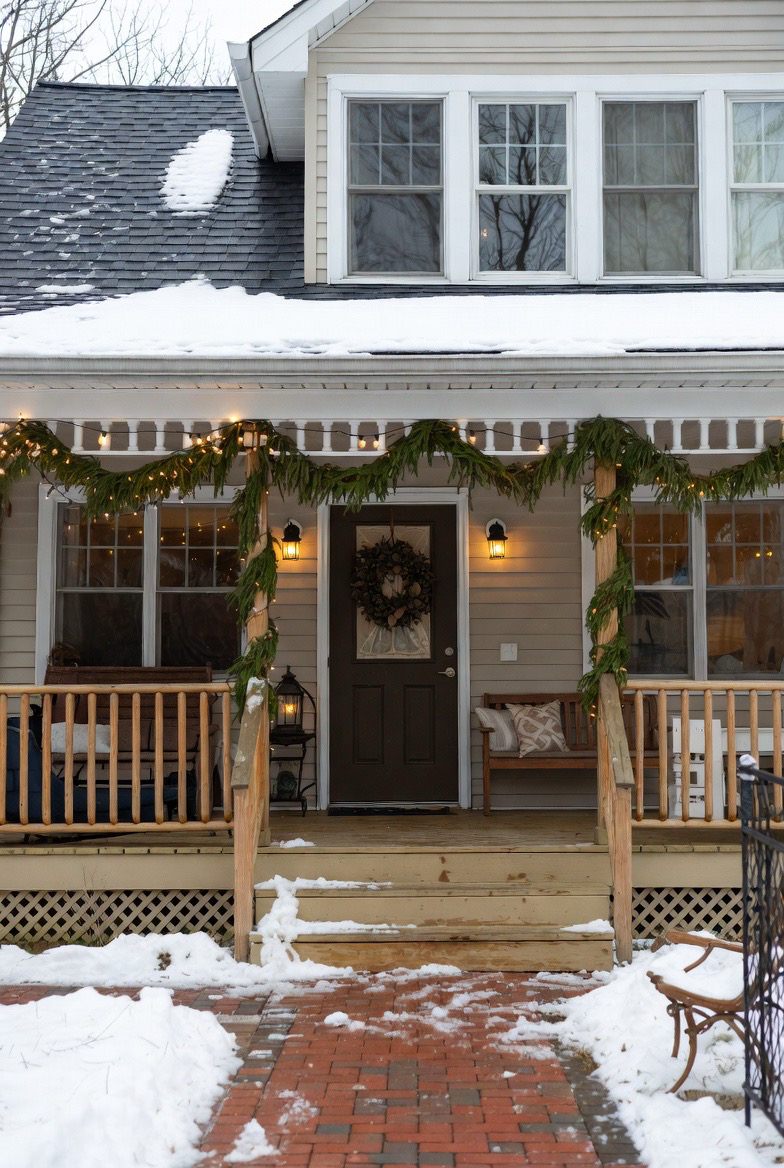 A decorated front porch adds instant seasonal magic. Evergreen garlands, string lights, and lanterns create a warm welcome while enhancing curb appeal during the colder months.
