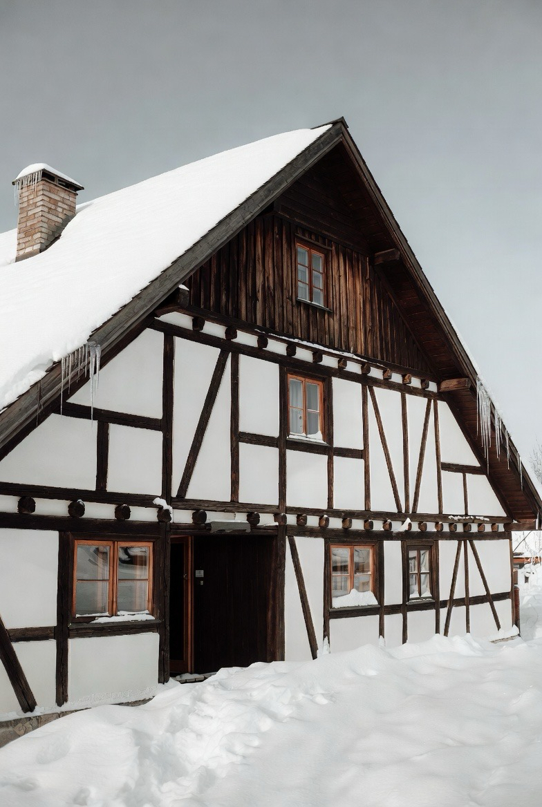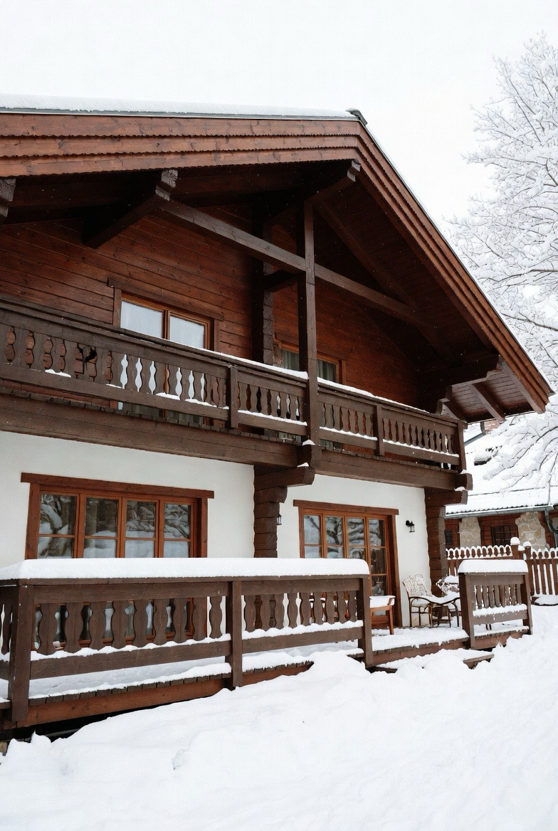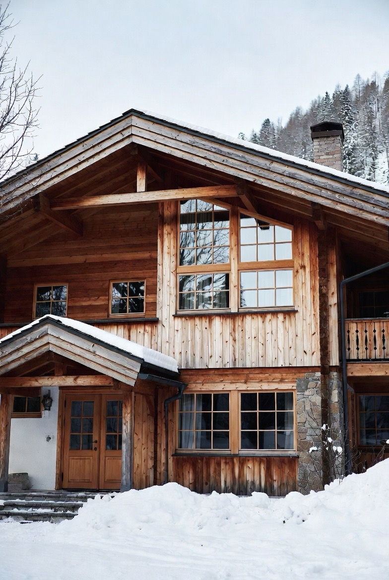 Timber framing adds warmth and structure. The exposed wood contrasts beautifully with snow for a magical winter look.
