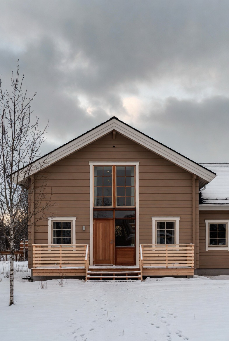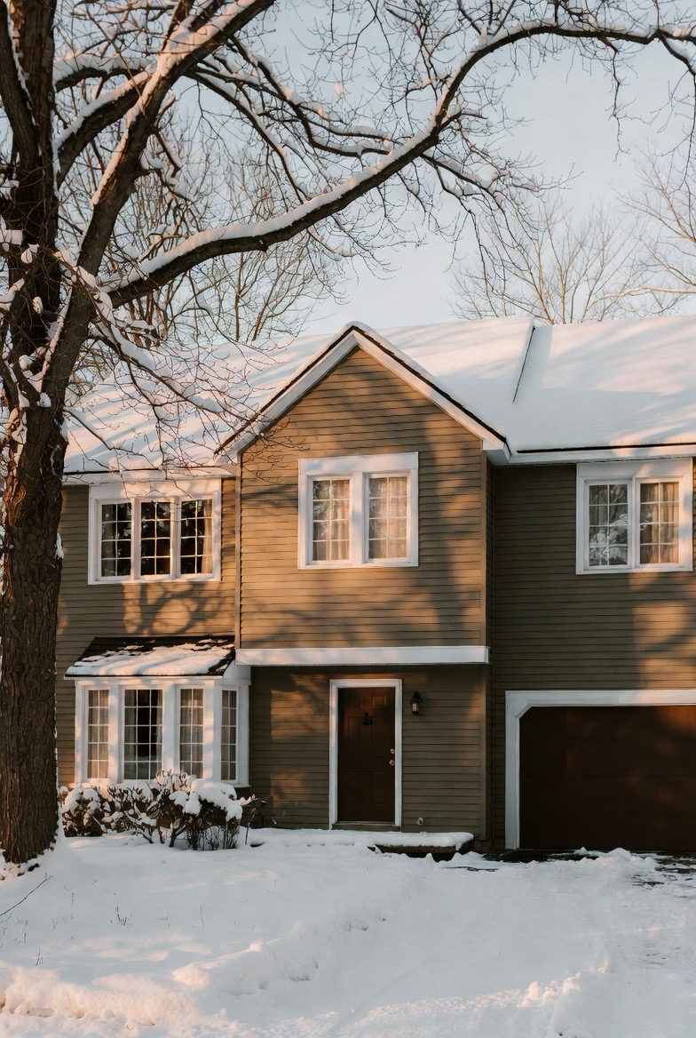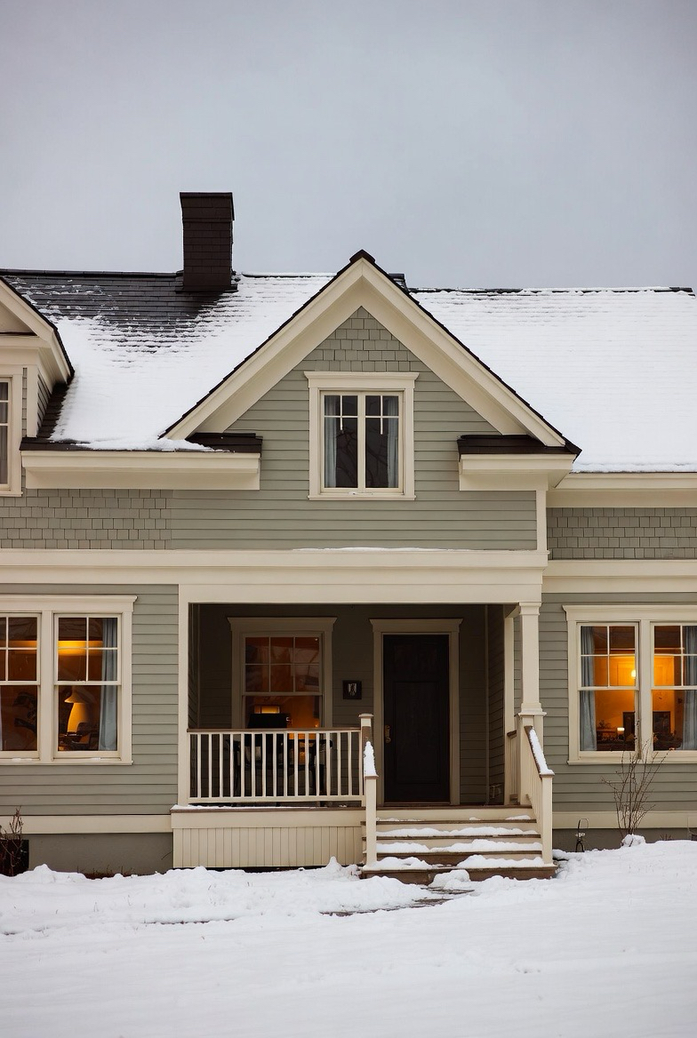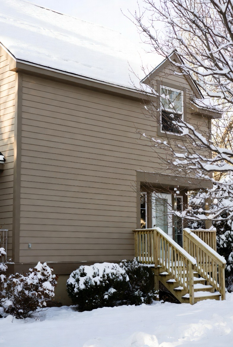 Warm siding colors like taupe or soft brown counteract winter’s chill visually.