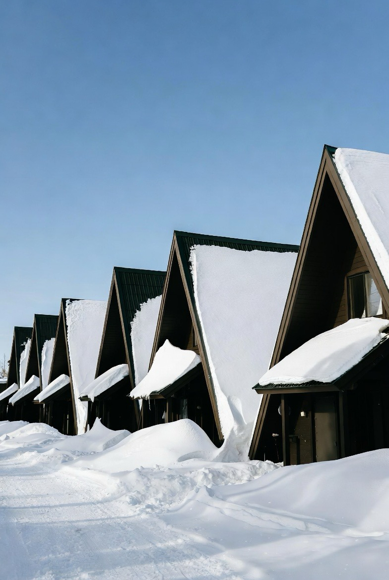 A-frame homes look dramatic and cozy when snow-covered. Their sharp rooflines shed snow easily while creating a bold winter silhouette.