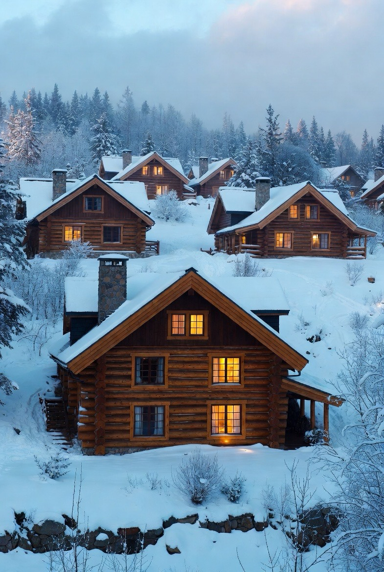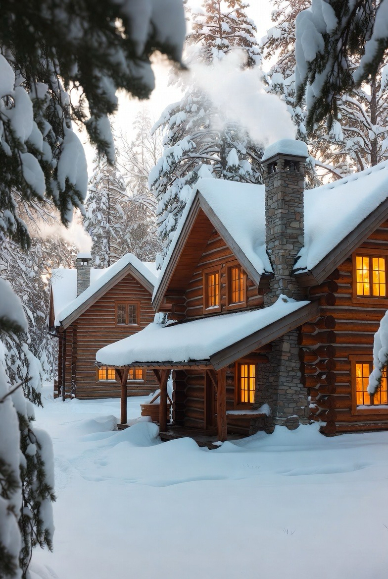 Log homes are the definition of winter coziness. Thick logs, stone chimneys, and glowing windows make these homes feel warm and inviting in snowy settings.