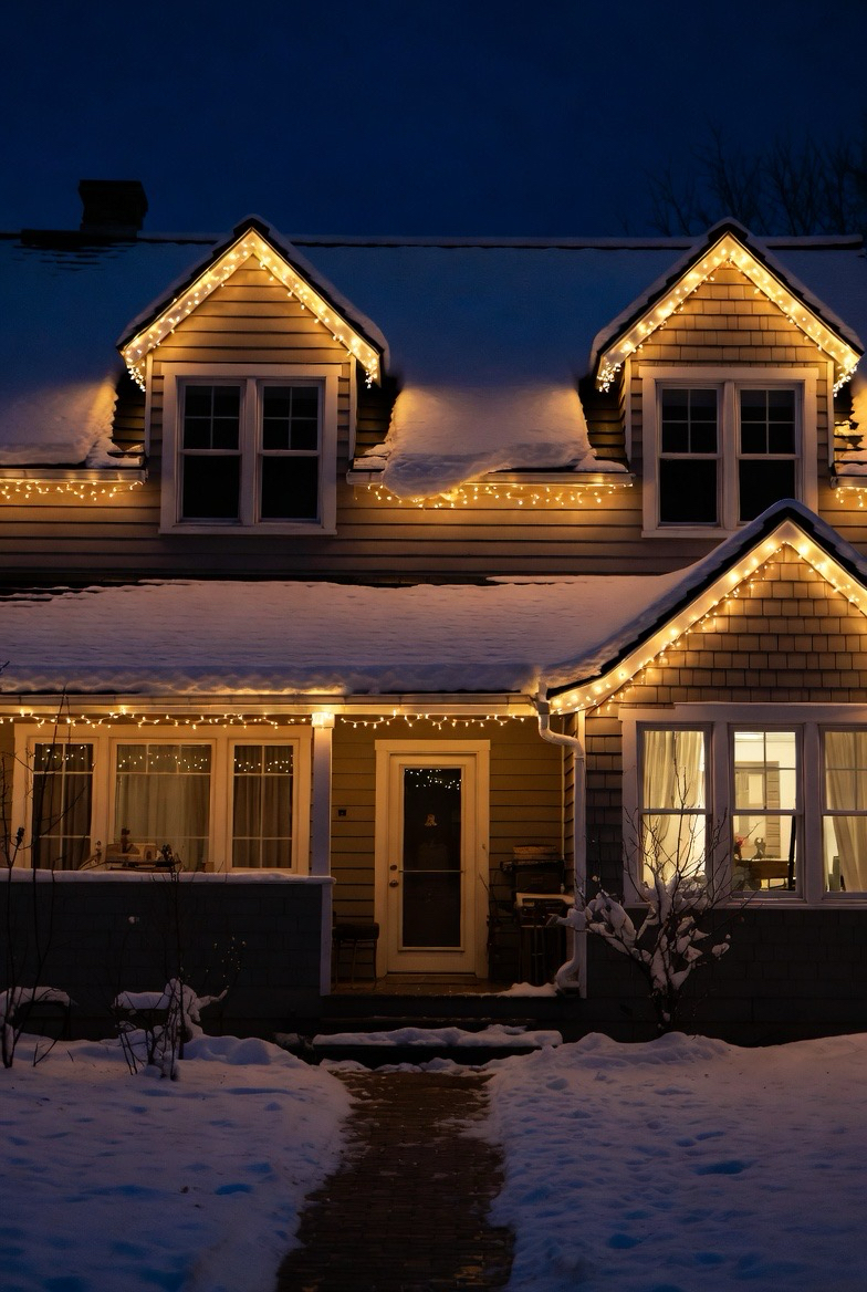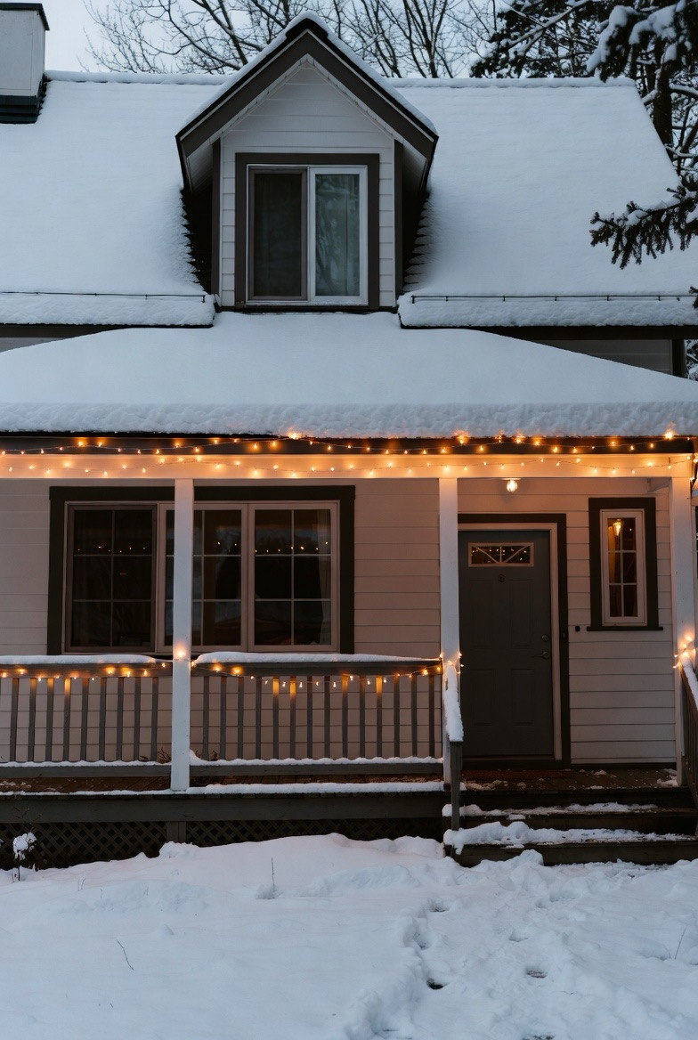 String lights add instant charm to winter homes. Draped along rooflines or porches, they create a festive glow without overpowering the exterior.