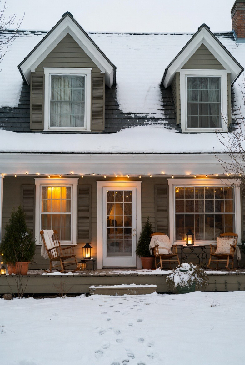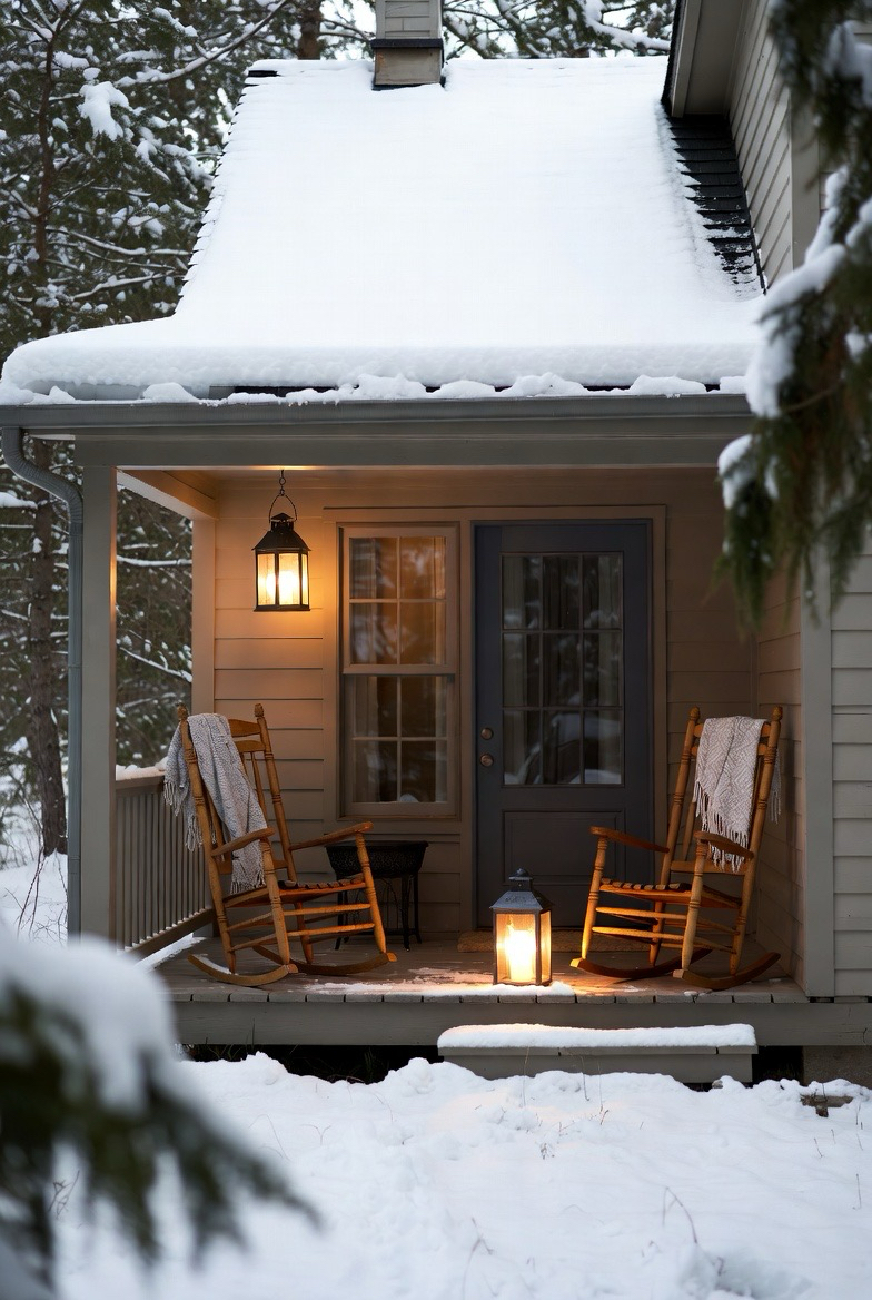Rocking chairs, blankets, and lanterns transform porches into winter-ready spaces. Even unused seating adds visual warmth and charm.