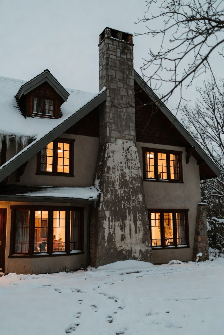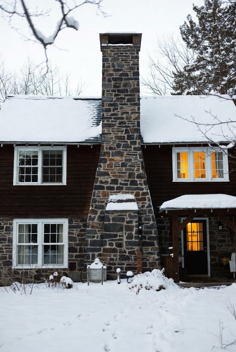 A large stone chimney becomes a winter centerpiece. It suggests warmth and comfort, especially when paired with softly lit windows.