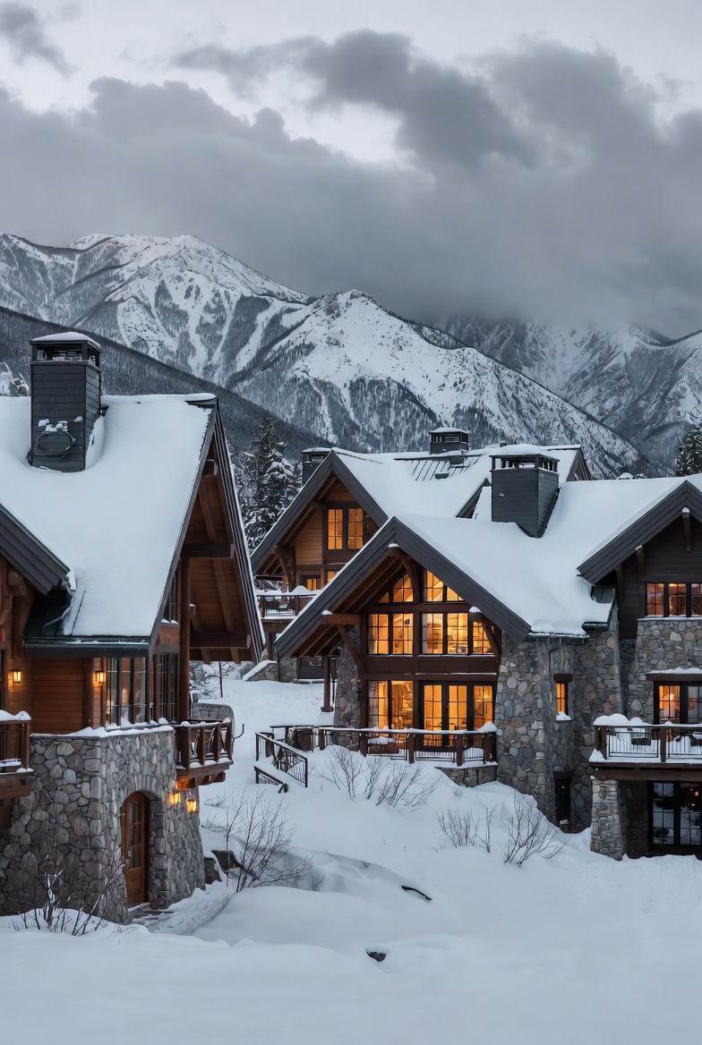 Mountain homes embrace winter with natural materials and expansive windows. Snow enhances their rugged beauty while interior lighting adds warmth.
