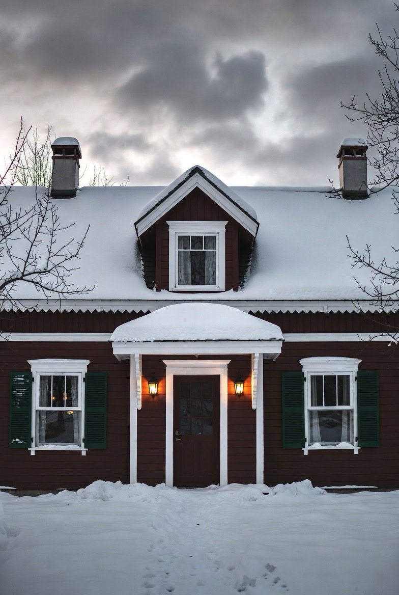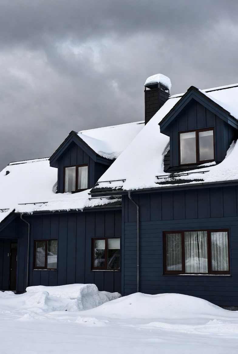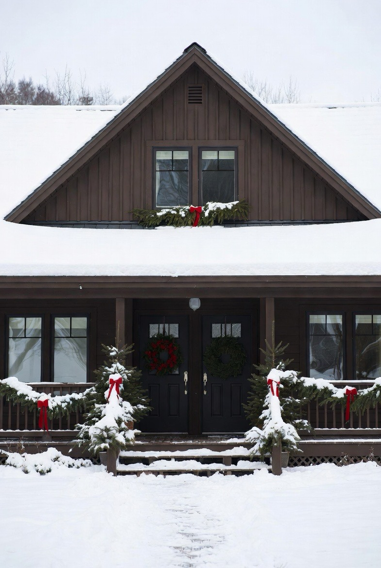 Snow resting on rooflines adds instant magic. Dark roofing materials enhance the contrast and highlight architectural details.