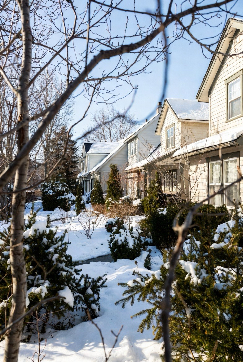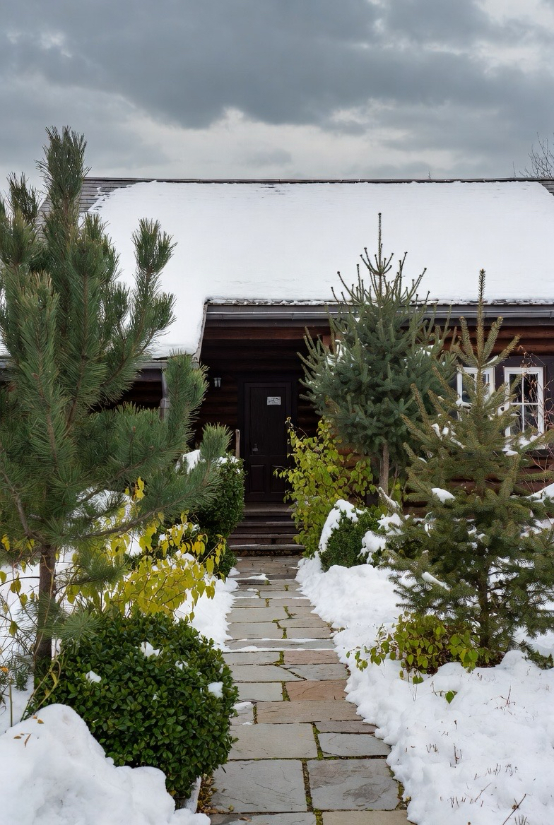 Winter gardens with bare branches and evergreens add texture and depth to exteriors.